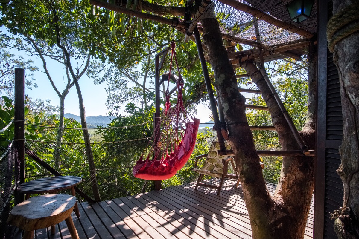 Miljövänligt trädhus, byggt och upphängt i taket av ett historiskt Jackfruktträd utan spikar eller cement. Inbäddat i Atlanten skogen, erbjuder det ett svalt klimat och utsikt över Paraty-Mirim havet. Ovanifrån kan du se fåglar och, med tur, andra vilda djur. Boendet inkluderar en liten dubbelsäng, fläkt, myggnät, sängkläder och badlakan och ett öppet badrum med gardiner för avskildhet. Begränsat Wi-Fi på toppen uppmuntrar återanslutning med naturen.