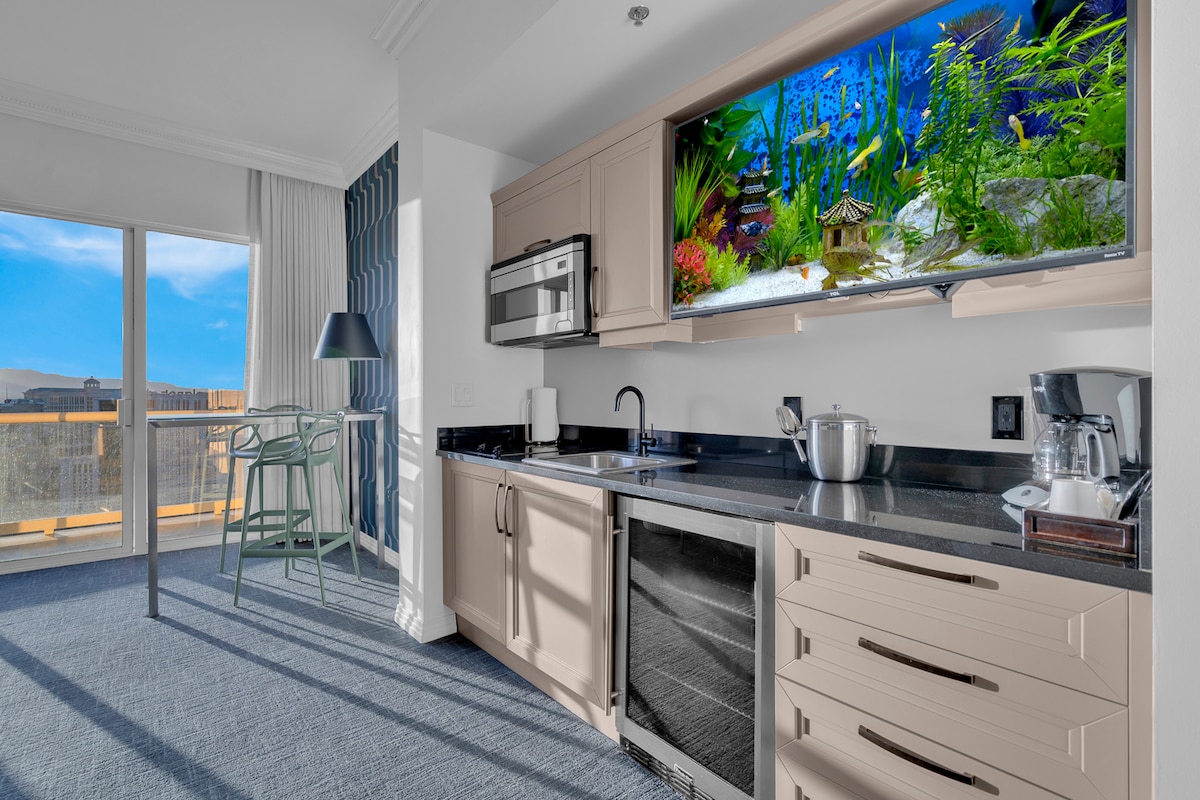 TOPPBETYGAD Omdesignad studiovåning med öppen balkong på 37:e våningen på The Signature Hotel på MGM Grand. Designermöbler, exklusivt WiFi, pentry, rostfria apparater, bänkskivor i granit, värdeskåp på rummet, jacuzzi, 50" Ultra HD Roku-TV och dubbelsäng med Cocoon Chill Sealy-madrass. Condo är 520 kvadratfot. Topprankade Airbnb-boenden i sin klass!