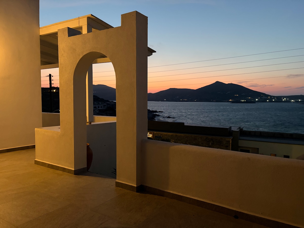 Öppna de havsblå fönsterluckorna och släpp in den svalkande brisen, och fixa sedan något att äta vid den urbana betongbänkskivan i en luftig tillflyktsort vid vattnet. Kliv in på den rymliga, lummiga verandan för lugna solnedgångsdrinkar med fri havsutsikt! Lägenheten ligger intill en sandstrand för ett morgondopp och 2 minuters promenad från centrum av Naousa och dess huvudtorget. Butiker, restauranger, barer och klubbar ligger inom gångavstånd, men området är mycket tyst och lugnt!