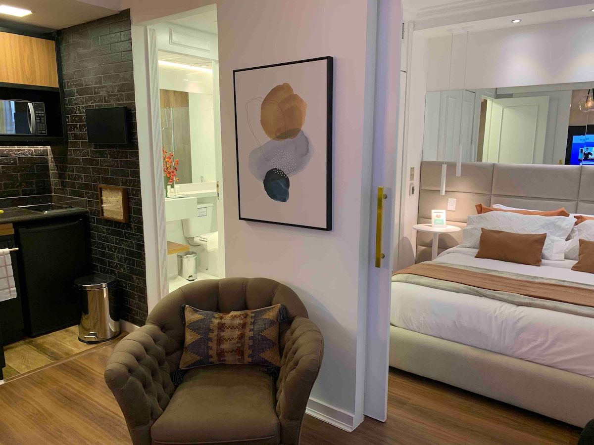 Exklusiv studio i Itaim Bibi, med modern och elegant inredning, fantastisk utsikt över staden och belägen nära restauranger, barer och butiker. Studion är utformad för att ge våra gäster en minnesvärd vistelse, med olika bekvämligheter, så att de känner sig som hemma, såsom internet med 400mb, utrustat kök, komplett säng och bad, bland annat. Dessutom kan de använda de gemensamma områdena med pool, gym och tvättstuga med betalning per användning.