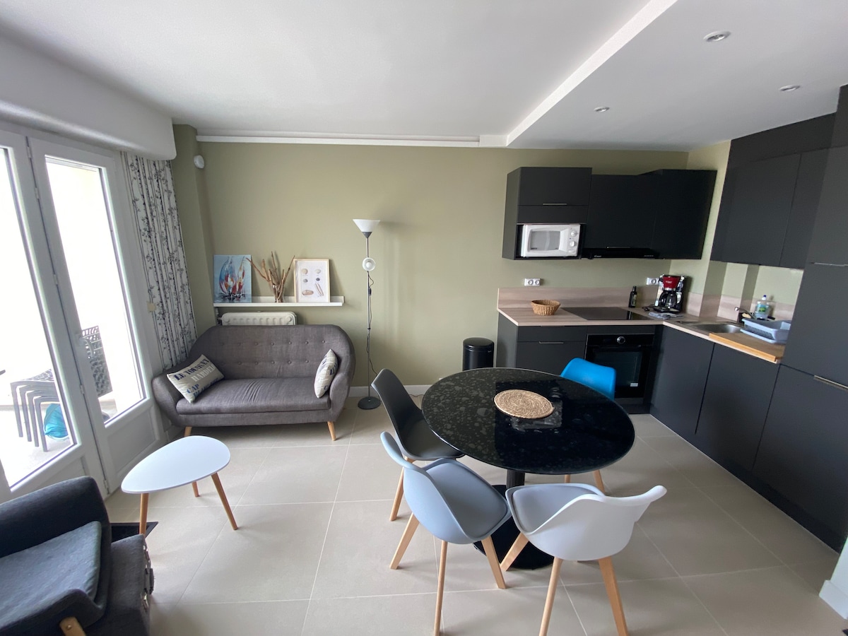 Nytt, fridfullt och centralt boende. Idealiskt beläget på Place Cordonnier, tyst, kan du koppla av vid vattnet eftersom lägenheten ligger 100 m från stranden. Beläget på bottenvåningen, är det den idealiska platsen för din semester, med ett sovrum att vila (säng 140x190), kan du bo för 4 personer, vardagsrum med en bäddsoffa och öppet till ett kök, och njuta av soliga dagar på den skyddade terrassen mot havet.