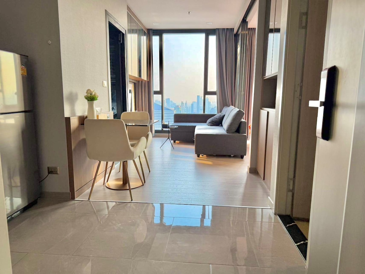 2 sovrum duplex med svepande panoramautsikt över Bangkok. Golv-till-tak-fönster översvämmar utrymmet med naturligt ljus, medan den moderna Japandi-inredningen skapar en lugn och elegant atmosfär som är idealisk för par, familjer eller affärsresenärer. Fullt utrustat kök, rymligt vardagsrum med 65-tums smart-TV och privat balkong. Direkt tillgång till gym och spa på samma våning, plus en takpool och soldäck ovanför. Matnav, kaféer och en 24/7 Mart finns inuti byggnaden,
