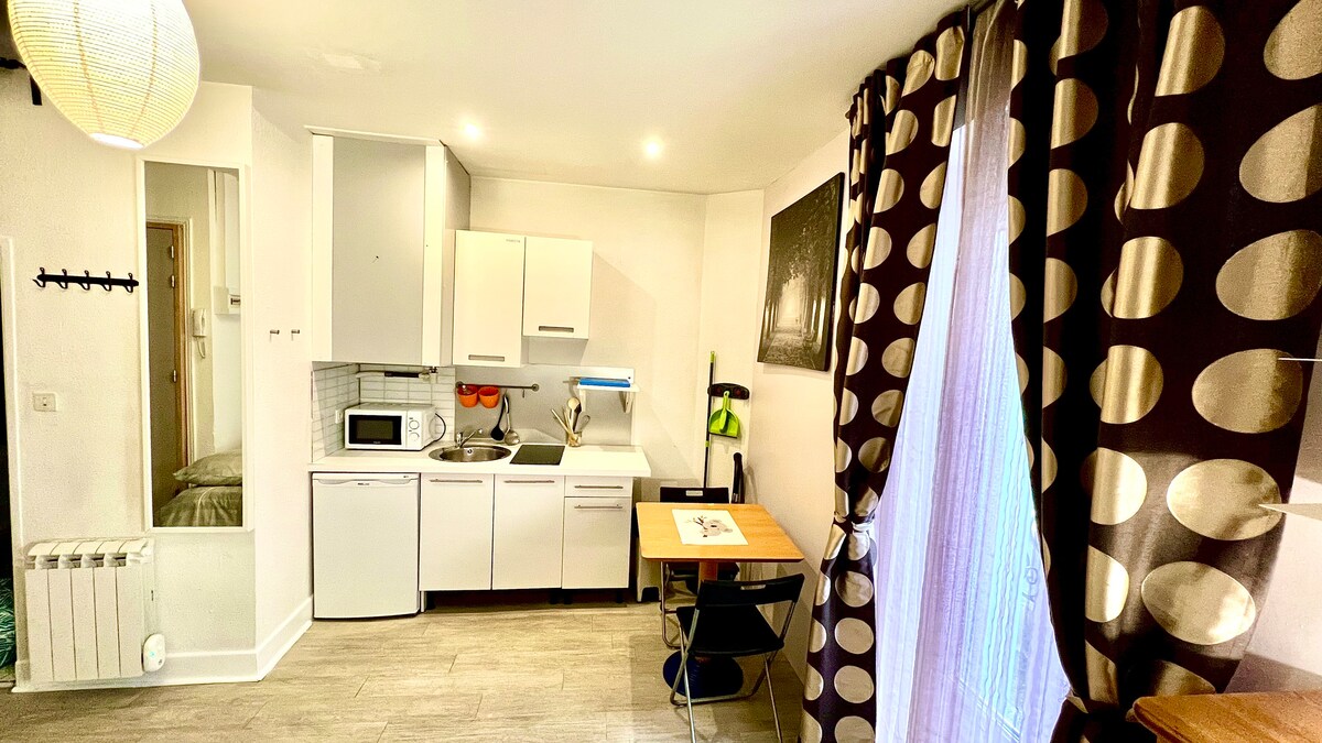 Studio på TOPPEN, HYPER CENTER PAU: Castle district med DJUP UTSIKT Pyrenéerna, smakfullt inredda & renoverade LUFTKONDITIONERING reversibel 3: e våningen GRATIS PARKERING 18h à 9h à 1' -MYNT TERRASS: 2 stora puffar fatboy, sittplatser avkoppling & måltider - Kokvrå: kylskåp/hällar/mikrovågsugn/Nespressomaskin/brödrost/vattenkokare/porslin köksredskap - Matplats med stolar - Vardagsrum/sovplats: garderobssäng med soffa/TV 80'/skåp/soffbord och stolar -SDB: dusch/toalett
