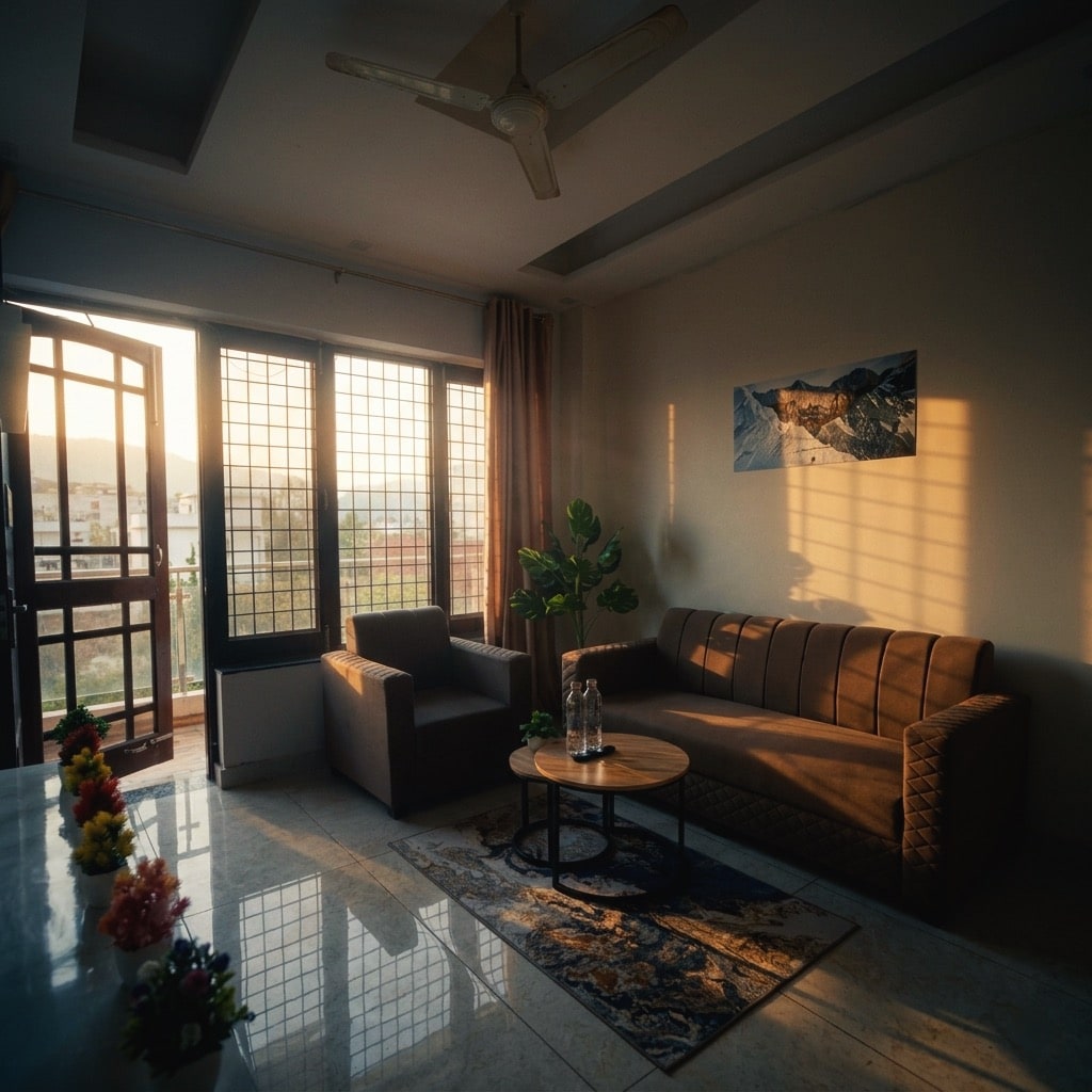 This Dehradun Mussorie home offers quiet premium and everyday comfort. A 2BHK concept with Dehradun-Mussorie valley view, kept it for Workation ready with mountain and Doon-valley view. Suggested stay in Dehradun-Mussorie Premium & thoughtfully curated furnishing layout create a space that feels both refined and welcoming. We dressed up this home in trendy way, ideal for guests who value privacy, comfort, simplicity and perfection. Designed in warm beige tones with a calm, minimal aesthetic.