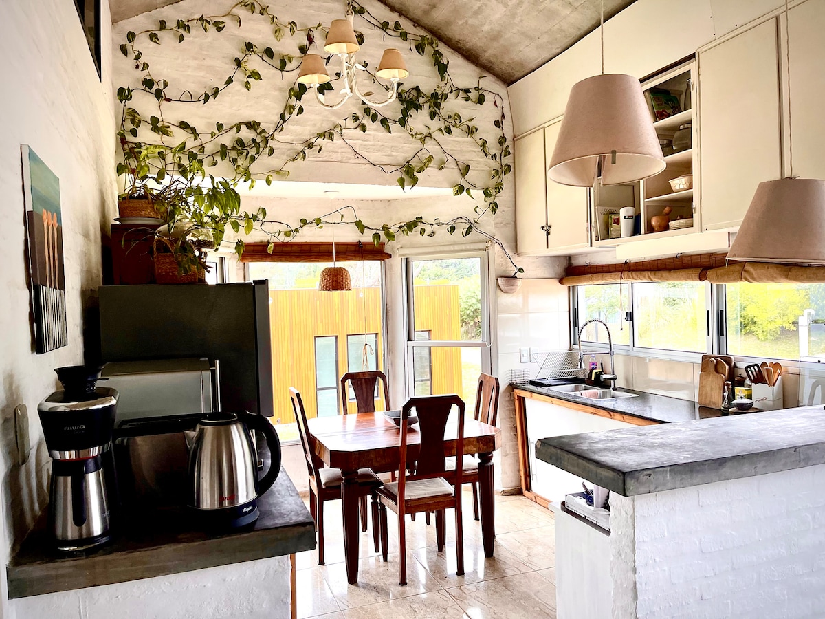 Mysig stuga i skogen i Punta Ballena. Perfekt för att komma iväg och vila i en naturlig och mycket fridfull miljö. Steg från Arboretum Lussich, perfekt för vandringar, promenader och njut av en kaffe med en utsökt La Checa-kaka. Minuter från Solanas Beach, Tío Tom, Las Grutas, Chihuahua. Vi har solstolar och paraply med uv-skydd. På vintern väntar vi på dig med Fueguito Engido. Huset är fullt utrustat för att få dem att känna sig bekväma som hemma.