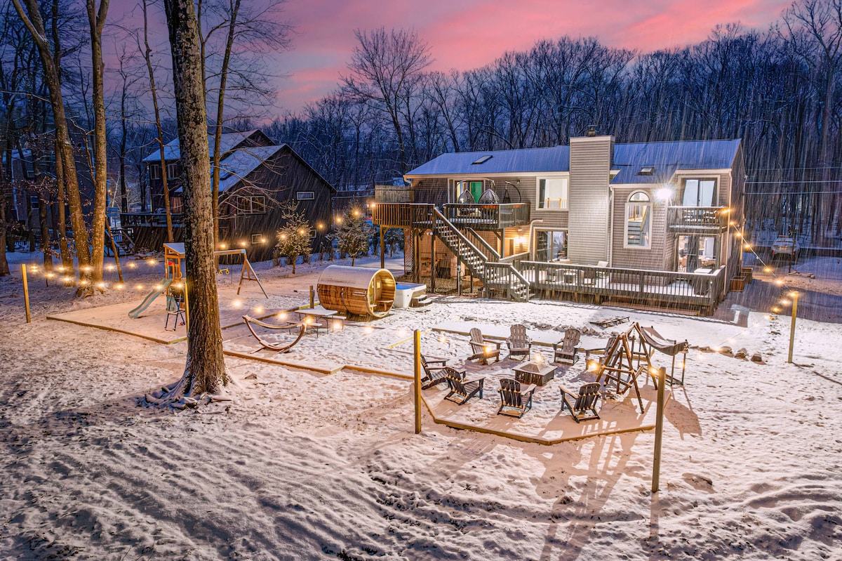 Skid-/tubingsäsongen är nästan runt hörnet! Fly till "Eclipse", en skandinavisk-inspirerad modern stuga inbäddad på .5 tunnland med utsikt över oändliga skogar. Eclipse erbjuder genomtänkta bekvämligheter som en slående gasspis, en rolig arkadkonsol, discgolf, lasertagg och en munvattenande popcornvagn för filmkvällar. Koppla av i bubbelpoolen under stjärnorna eller sola dig i den LED-belysta A-ramscharmet. På "Eclipse" stämmer alla stjärnor för en verkligt magisk vistelse.