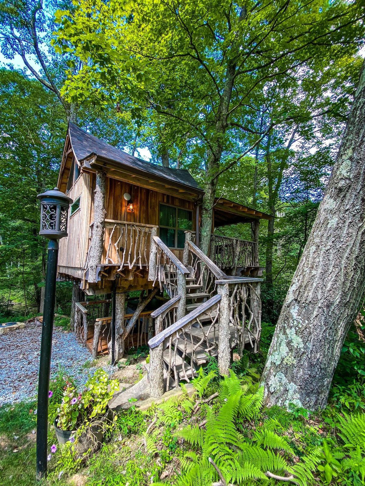 This beautiful treehouse lifts guests into the trees with the peak of the structure reaching 30 feet into the air. This private, tiny home and balcony is all yours with no shared spaces. Enjoy the ground level covered patio complete with furniture and a gas grill perfect for cookouts after long hikes at Rickett's Glen. Immerse yourself in the beautiful landscapes of this woodland experience. Perfect base for your outdoor adventure to Ricketts Glen State Park, only 2.5 miles.