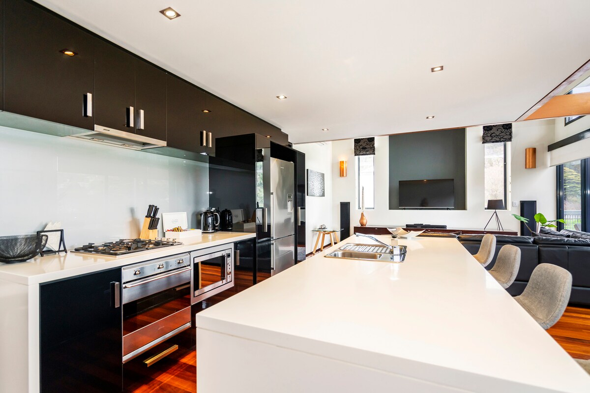 Ett elegant, solfyllt radhus bara några minuter med bil från stadens centrum. Fantastisk utsikt över Launceston och Tamarfloden kan ses genom trädtopparna och i fjärran skogiga bergssluttningar. Över vägen leder en stig ner genom Cataract Gorge. Det eleganta, välfyllda biblioteket har en bekväm soffa och en dedikerad arbetsyta med skrivbord och stol. Ett soligt däck lockar. Snabbt wifi och en smart-TV av hög kvalitet med streamingtjänster är tillgängliga. Eklektisk, originalkonst överallt.