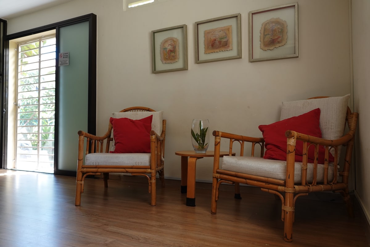 En mysig och unik nyrenoverad privat svit med en egen mini privat innergård! Beläget i ett bostadsområde bara 10 minuters bilväg till centrala Kuala Lumpur. - 10 minuters promenad till LRT Jelatek (Kelana Jaya Line) - 10 minuters tågresa till KLCC - Tillgång till WiFi - 2 sovrum med luftkonditioneringsenheter - 1 badrum (varm dusch, handfat, toalett, handdukshängare och handdukar) - Vardagsrum med skjutdörrar i glas, TV, soffa, kök och matplats