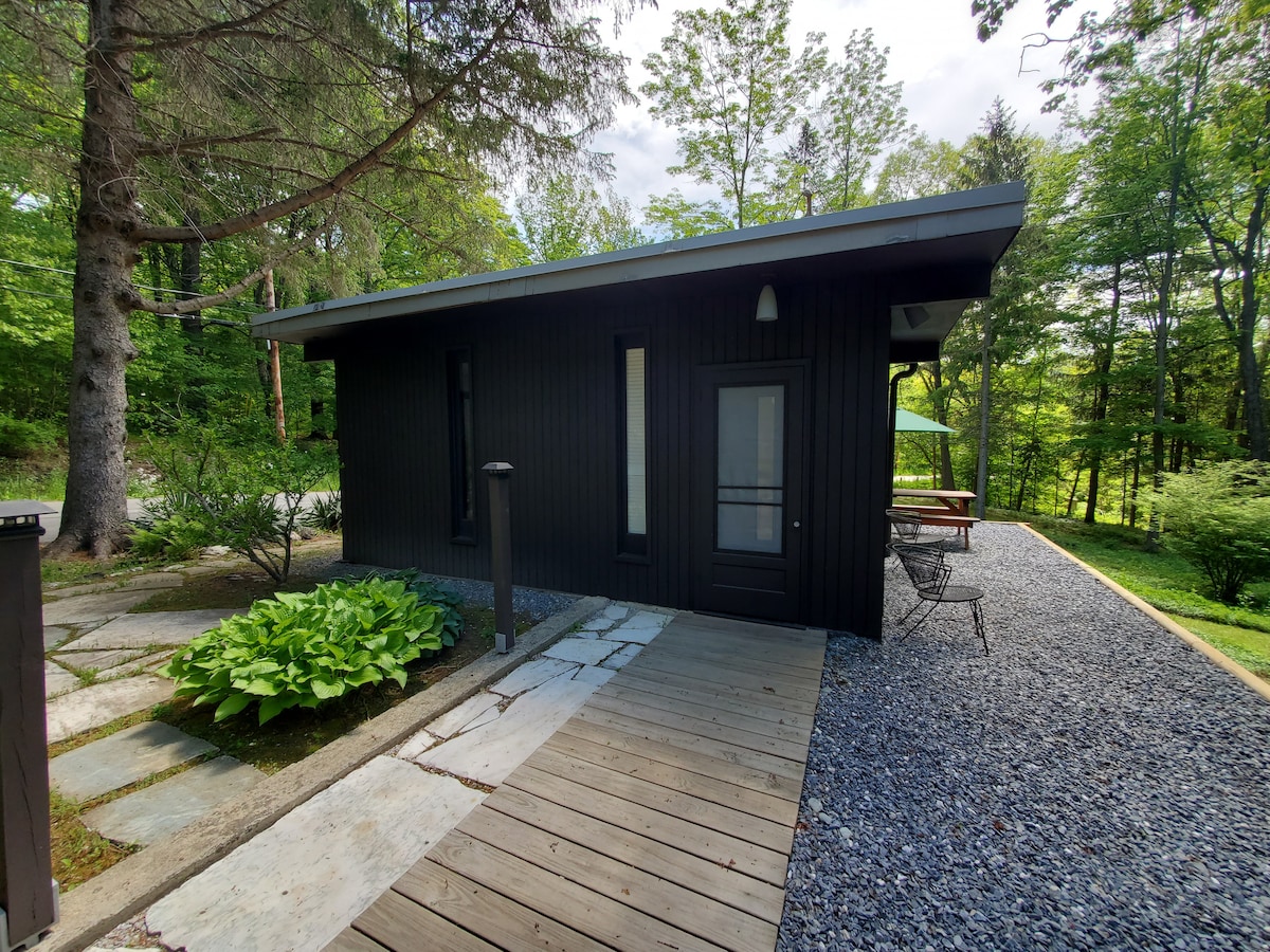 Blue Cabin är en mysig, designframåt tillflyktsort mellan huvudstadsregionen och Berkshires. Njut av välvda trätak, ett skogsgrönt kök och ett spa-liknande bad. Utanför kan du koppla av i den täckta loungen med U-formad sektionsdelad, kolgrill och TV – eller utforska trädgården, där en bäck rinner igenom och en säsongsbetonad blomsterträdgård blommar. Lugnt, privat och perfekt beläget för både vila och äventyr.