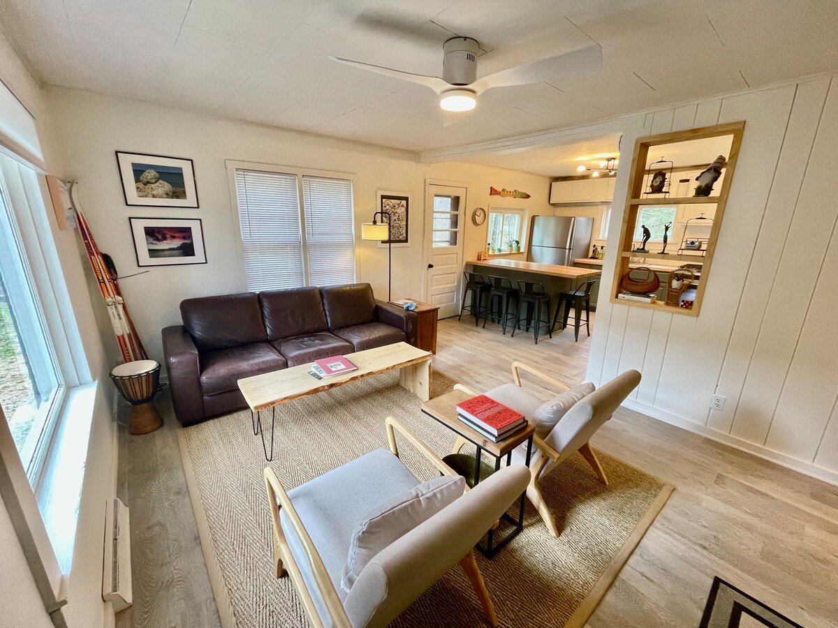 En unik gammaldags stuga som ligger precis vid Bear River och Petoskeys nyutvecklade Bear River park och stig. En en kilometer lång slingrande promenad, över floden och genom skogen tar dig till centrala Petoskey och Lake Michigan. Längs flodpromenaden i motsatt riktning finns en skatepark och löpningsspåret. Även nära shoppingtorgen och ett robust shoppingdistrikt i centrum. Huset är hundvänligt med en inhägnad på gården och har tre verandor att titta ut över floddalen.