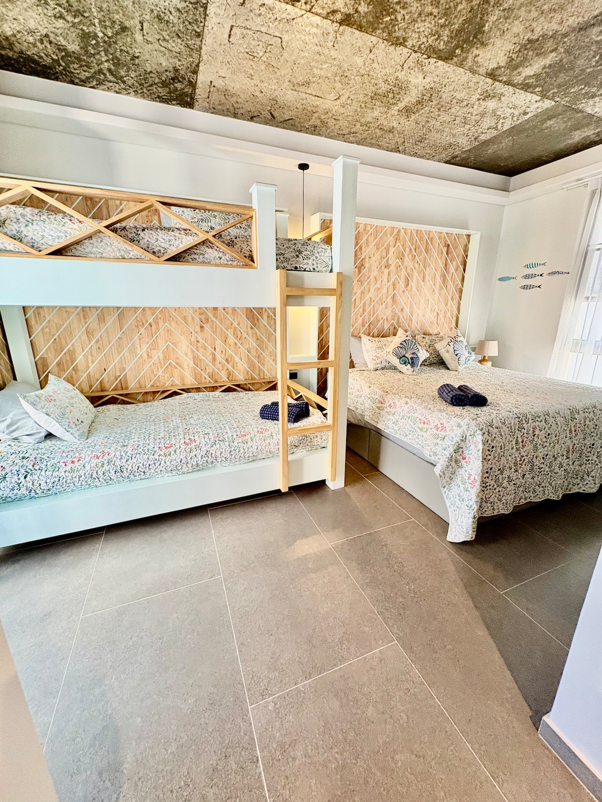 Vårt familjerum med våningssäng på Ozonicia är idealiskt för familjer och rymmer upp till fyra gäster. Rummet har en kingsize-säng för vuxna och en våningssäng för barn eller ytterligare gäster. Det har ett privat badrum, bekväma sängkläder och ett skrivbord, vilket gör det till ett praktiskt och mysigt utrymme. Gästerna har också tillgång till ett gemensamt kök med spis, kylskåp, luftfritös, mikrovågsugn, mixer och matbord – perfekt för en bekväm vistelse i Mai Khao, Phuket.