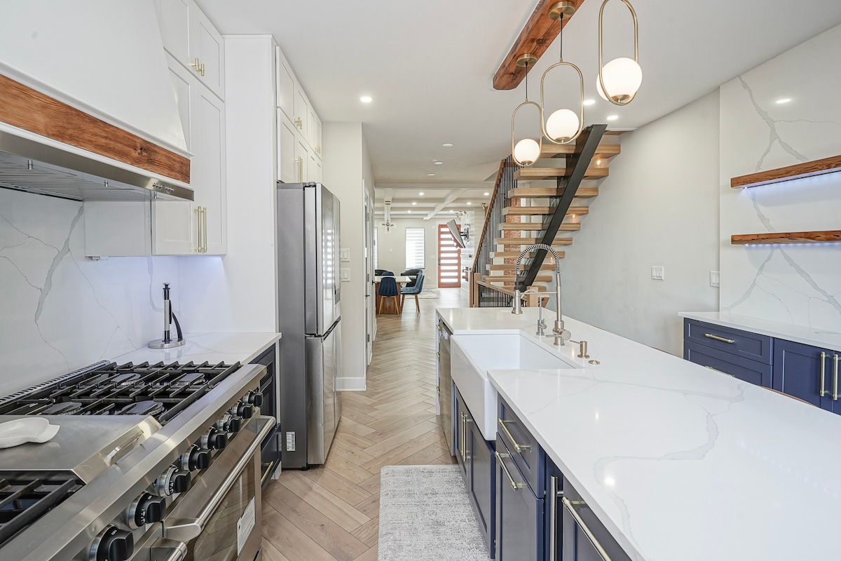 Bo i detta lyxboende med 4 sovrum/4,5 badrum i South Philly – rymmer 14 - Steg till tunnelbanan 🚆 | Promenera till Target, Giant, Starbucks - 10 minuter till Center City, stadioner och historiska sevärdheter - Privat takterrass med utsikt över stadssilhuetten + balkongsvit – Perfekt för matchdagen – nära Phillys arenor 🏈⚾🏀⚽ - Omgiven av några av Phillys bästa mat (Angelo's, South Philly Barbacoa, Bok Bar, Reading Terminal Market, Chinatown) - Gourmetkök + öppen matsal – Spa-inspirerade bad • Duschkabiner och badkar
