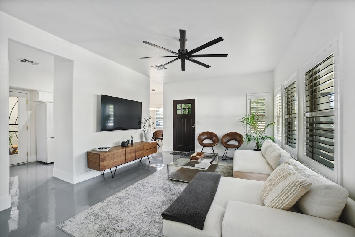 Helt ombyggd studio som ligger i ett grindat 10 enhets lägenhetskomplex och inkluderar en privat grindad uteplats, fullt utrustat kök, tvättmaskin och torktumlare, blixtsnabbt Wi-fi och en 65" Samsung smart-TV. Oändlig underhållning och restaurangval inom några minuters promenad. Avstånd från enheten till..... Konferenscenter — 1,0 miles Footprint Center — 1,0 miles Chase Field — 1,3 miles Van Buren - 0,3 miles Arizona Financial Theatre — 0,6 miles Tveka inte att fråga om du behöver ett annat landmärke kartlagt.