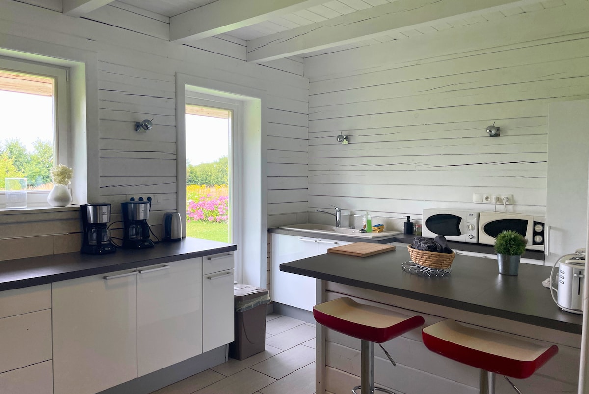 Ekologiskt trähus med fältutsikt, 14 km till havet