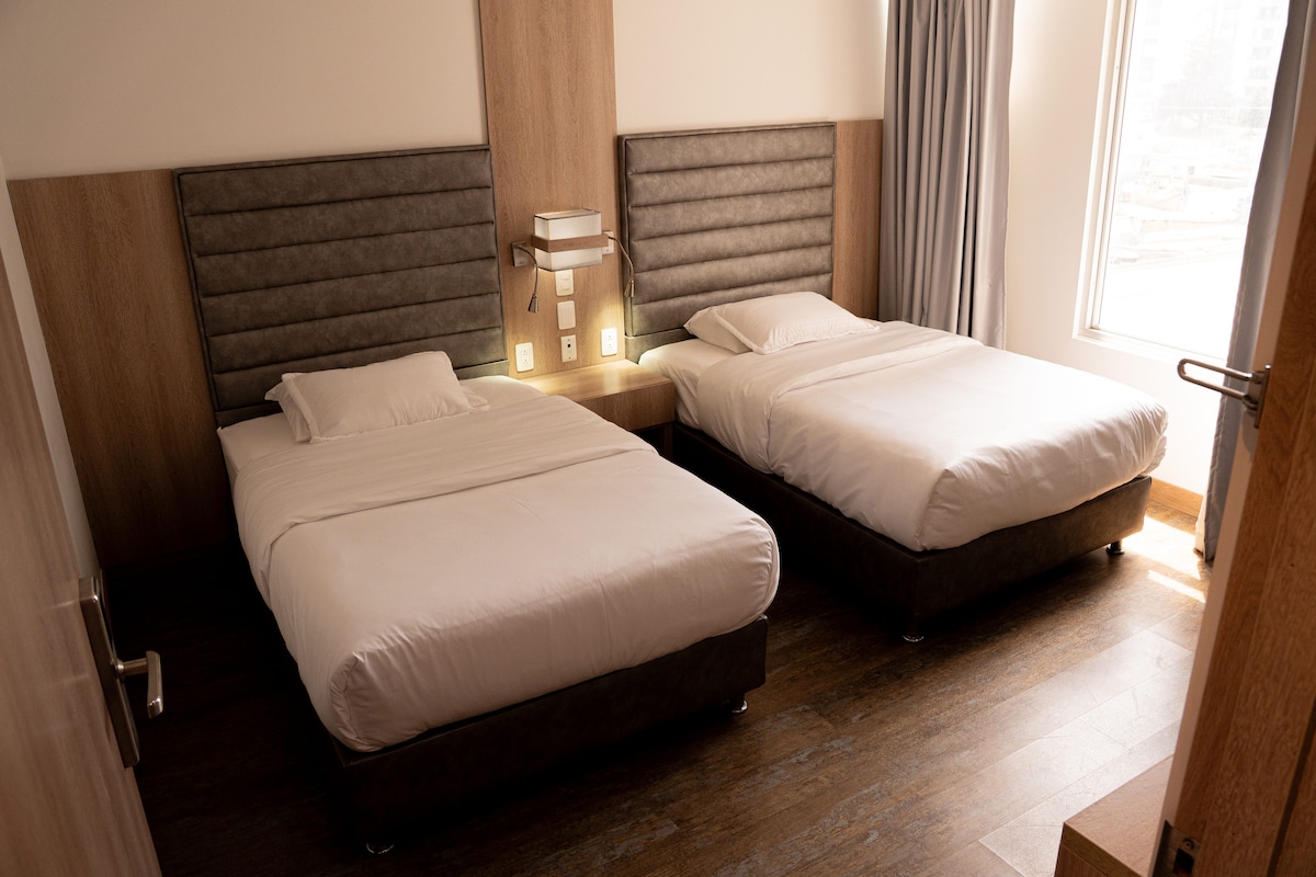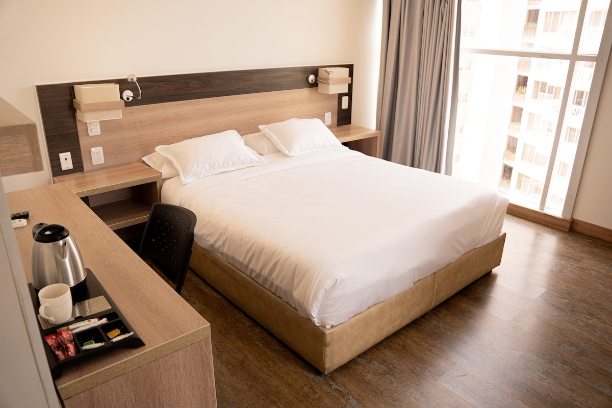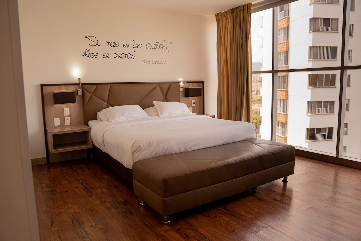 Habitación moderna y acogedora, con amplios ventanales que brindan excelente iluminación natural. Su diseño elegante y cómodo la hace ideal para descansar. Ubicada en una zona estratégica, cerca de centros comerciales, restaurantes y clínicas. Perfecta para viajes de descanso o negocios. ubicada en una zona estratégica y privilegiada, cerca de centros comerciales, clínicas, Carlos Ardila Lülle, Clínica Foscal, HIC Instituto Cardiovascular.