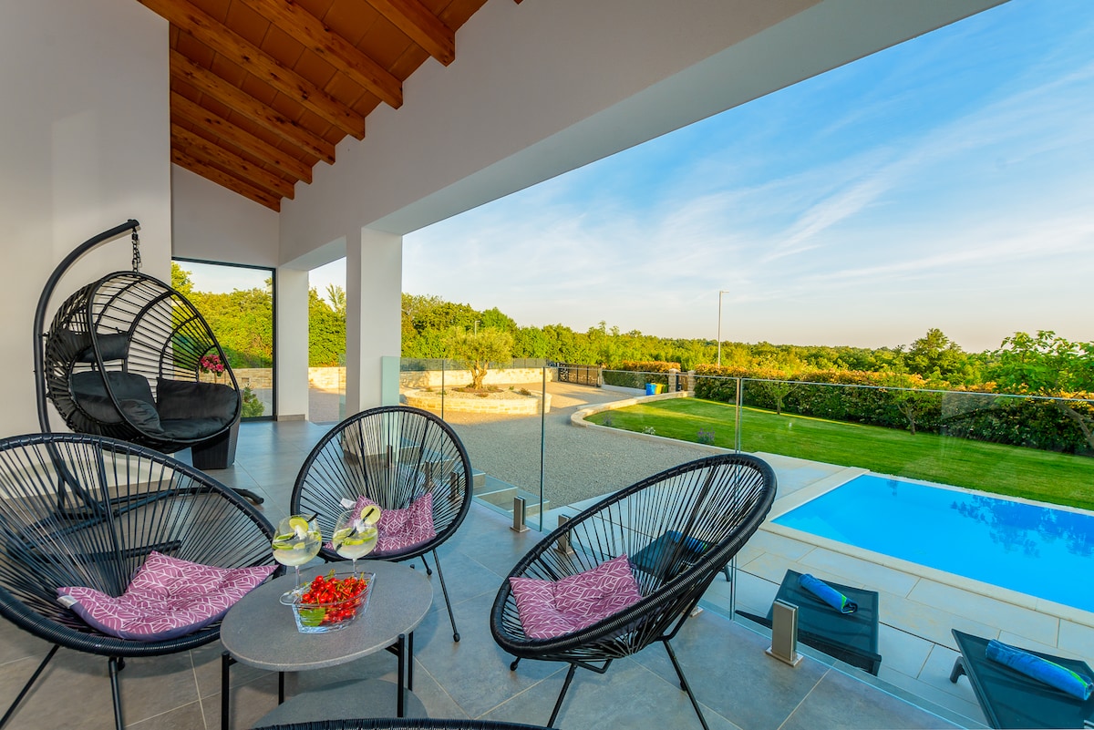 Stilren villa nära Rovinj med bildvärdig pool, nedsänkt i bubbelpool, bastu. Vakna upp till frodig, panoramautsikt över dalen. Par och familjevänligt, en kort bilresa till äventyrspark, Brijuni National Park, dinopark, medeltida städer och lokala rätter. Det är en sann grön tillflyktsort för alla som vill komma tillbaka till naturen med all komfort i det moderna livet. Fullt utrustat för matlagning och underhållning i 2600 m2 trädgård (fotboll, speedball, badminton och pool kul) för dina barn och nära och kära att njuta av.