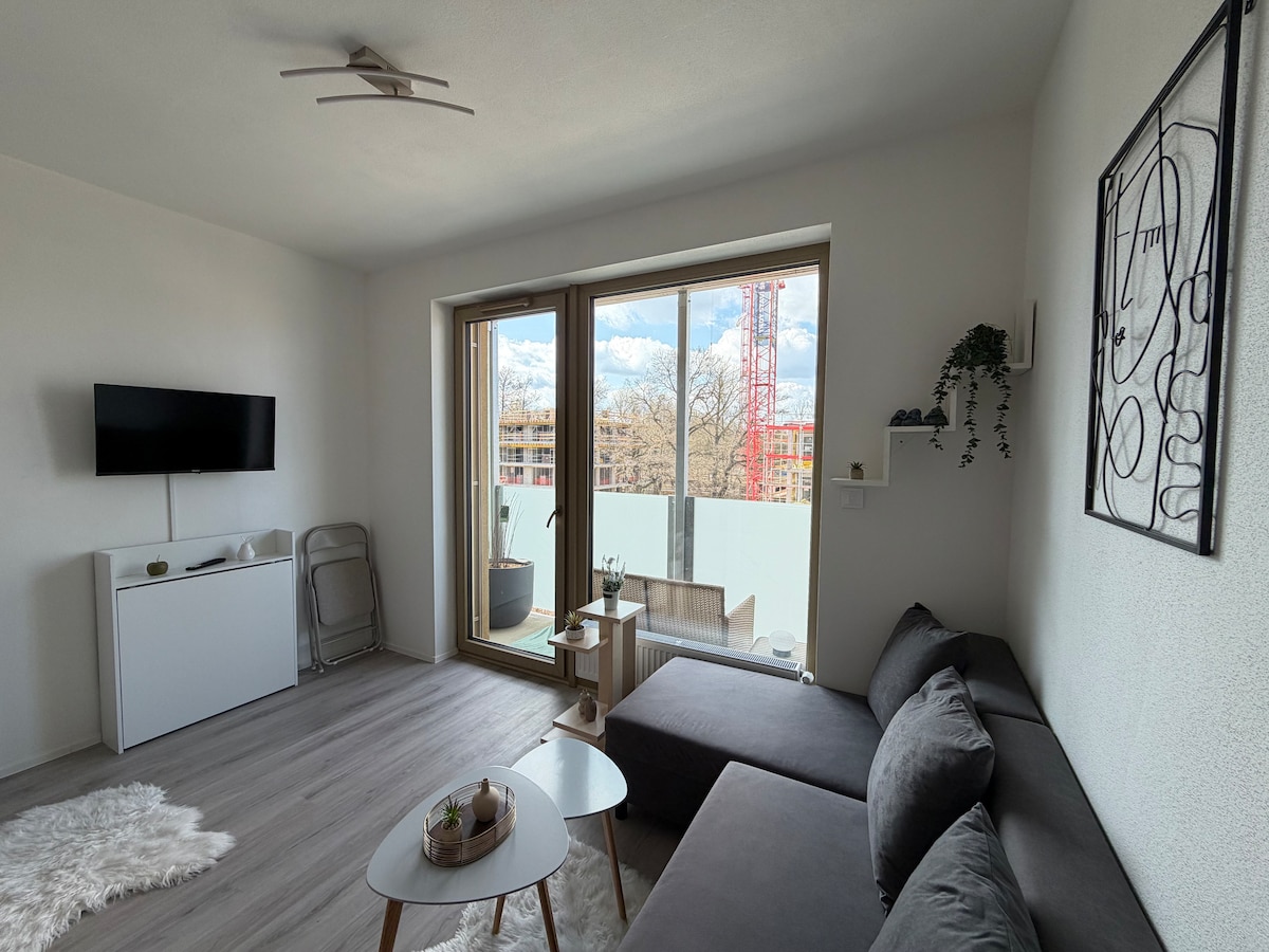 Denna moderna takvåning på översta våningen i en ny bostadsbyggnad erbjuder elegant och bekvämt boende, perfekt för par, ensamma resenärer, affärsresor och nyårsfirande (Silvester). Lägenheten har ett vardagsrum i öppen planlösning med en soffa, matplats, ett fullt utrustat pentry, en bekväm dubbelsäng och förvaring. En privat balkong med öppen utsikt är perfekt för avkoppling. En gratis flaska Bohemia Sekt Prestige ingår.