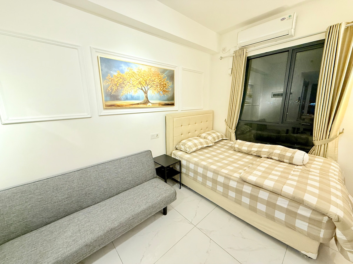 Ett rum med minimalistisk design får dig att känna dig som hemma. Beläget i strategiskt område: 5 minuter till Aeon alam sutra köpcentrum 10 minuter till naturens levande värld i silke 15 minuter till Sumarecon Serpong Mall 5 min Binus University 5 min Bunda Mulia University 5 minuter till Jakarta Premium Outlet 5 minuter till Ikea Massor av restauranger 30 minuter till flygplatsen Simbassäng Gym Lekplats för barn Mötesrum Upp till 3 gäster ( 1 medellång känsla i bäddsoffa)