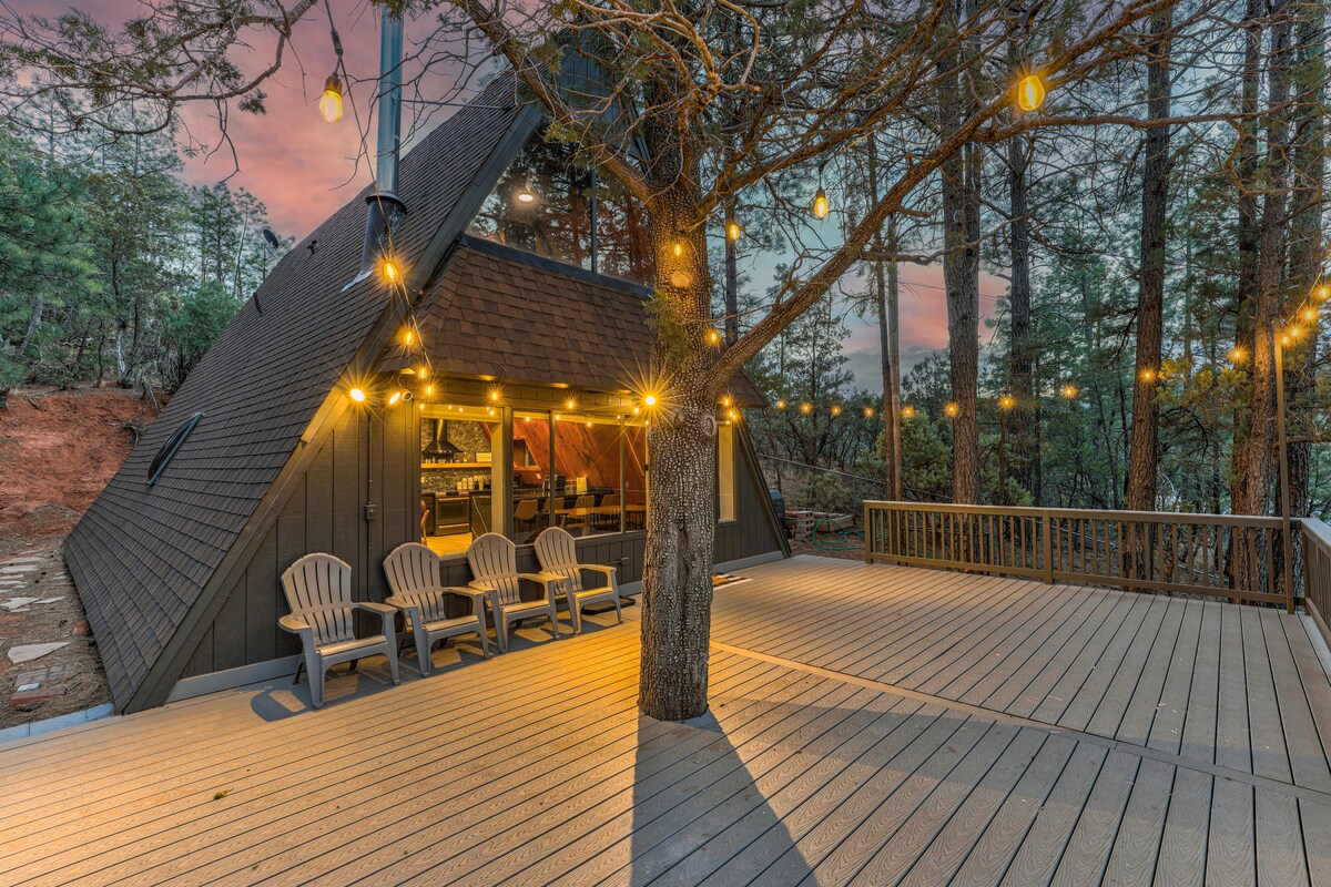 Fly från stadslivet i denna mysiga fjällstuga i Tonto National Forest. Dess omslutande dubbeldäck med utsikt över Mogollon Rim är perfekt för att titta på soluppgångar, solnedgångar, djurliv och stjärnskådning. Det finns 2 sovrum med queensize-sängar (ett har ett eget badrum), och det finns en murphy-säng i biblioteket. Biblioteket har en stor arbetsyta med två skrivbord. Stugan är den perfekta basen för avkoppling, vandring, arbete på distans, besök Fossil Creek, Tonto Natural Bridge och mycket mer!