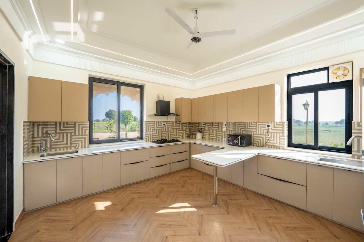 Leaf Haven-privat 3-rumslägenhet lyxig villa i bondgårdsstil med en cocktail/djup pool på Ajmer-Delhi Road, Jaipur. En perfekt helg i naturen för att fly från stadens jäkt, perfekt för par, familjer och vänner. Omgiven av grönska, liljedamm, fontäner och öppna gräsmattor. Vakna upp till fågelsång, varva ner vid brasan under stjärnbelyst himmel och njut av fridfulla stunder nära naturen men ändå väl ansluten till staden. Lång vistelse/arbete hemifrån vänlig – hemtrevlig komfort. En paus från världen återvänder till dig själv