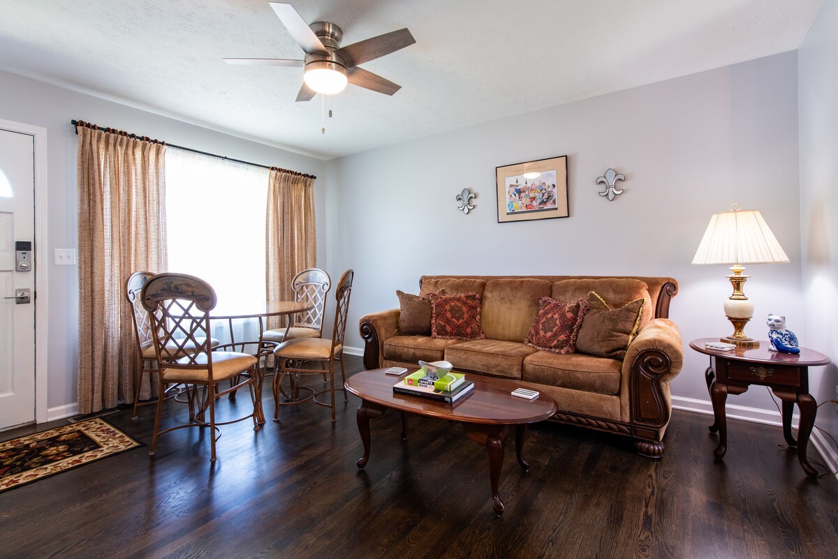 Nära Churchill Downs (7 minuter) UofL (5 minuter) centrum (10 minuter) Convention Center (10 minuter) Fairgrounds (4 minuter), och nära restauranger, barer och kaféer. Boendet erbjuder två sovrum med queensize-sängar och en utdragbar soffa i vardagsrummet. Njut av kaffe eller en avkopplande kväll på altanen på baksidan. Köket är fullt utrustat och det öppna vardagsrummet erbjuder ett bra område för umgänge. Lokalt tillverkad konst och inredning visas ut, vilket bidrar till det unika med utrymmet. Inga lokala bokningar tack!