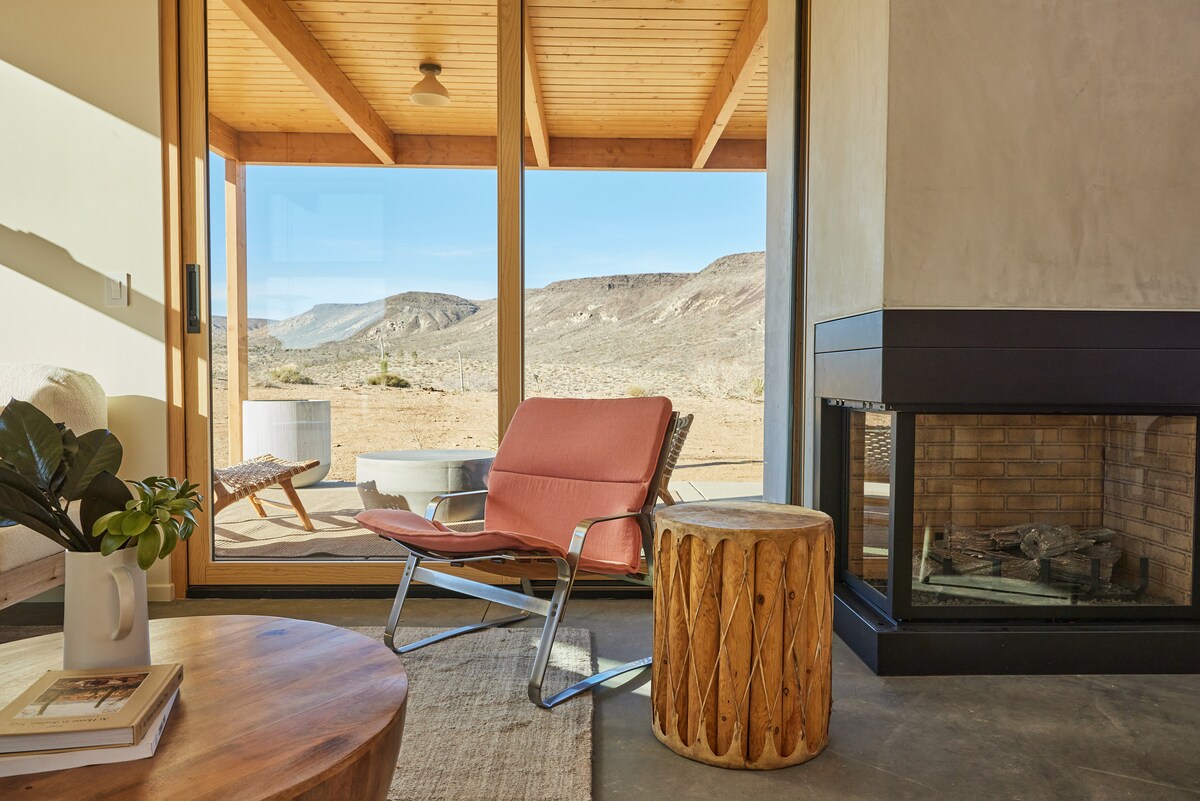 Kom och dra dig tillbaka, koppla av och ladda batterierna i denna moderna fristad med 2 sovrum i Pioneertown nĂ€ra Joshua Tree. đ” Denna retreat har höga tak och en skjutdörr i glas som öppnar till ett tĂ€ckt dĂ€ck med gungor, lounge sittplatser, matplats och en eldstad. TvĂ„ sovrum med king size-sĂ€ngar fĂ„ngar soluppgĂ„ng och solnedgĂ„ng över Sawtooth Mountains och Pipes Canyon. Du kan anvĂ€nda den delade saltvattenpoolen och en privat jacuzzi pĂ„ uteplatsen, utan extra avgift! LĂ€gg till ett ljudbad ocksĂ„ om du vill. Tryck pĂ„ â€ïž för att spara eller boka dina datum nu.