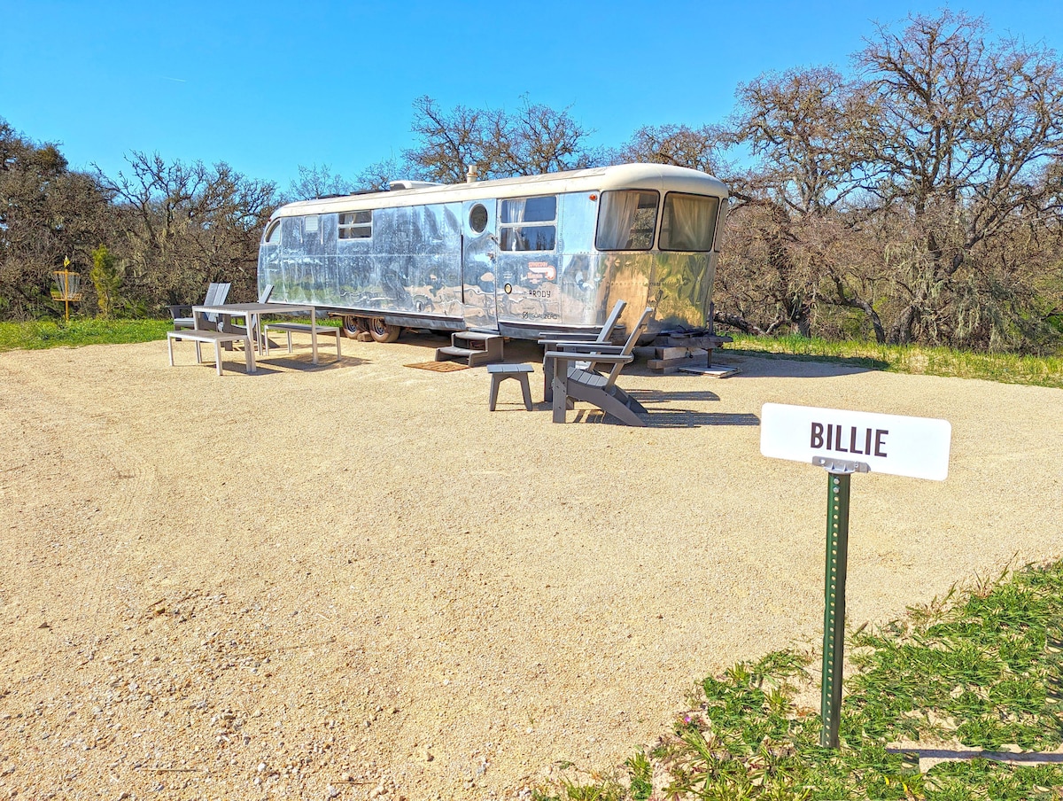 En restaurerad vintage-trailer inspirerad av Billie Holiday. Billie har en dubbelsäng Queen dagssäng, pentry med mikrovågsugn, minikylskåp, varmvattenberedare, fransk press, AC, värmare, skivspelare, adirondacks och bord. Steg bort finns 5 badrum varma duschar. Handdukar, sängkläder, grundläggande köksutrustning tillhandahålls. Den anpassade husvagnen ligger på en 120 tunnland stor vingård ranch bland böljande kullar, ekar, episk utsikt över solnedgången. Njut av vinprovning, grill, eldstad, vandring, frisbeegolf, utsikt över solnedgången.