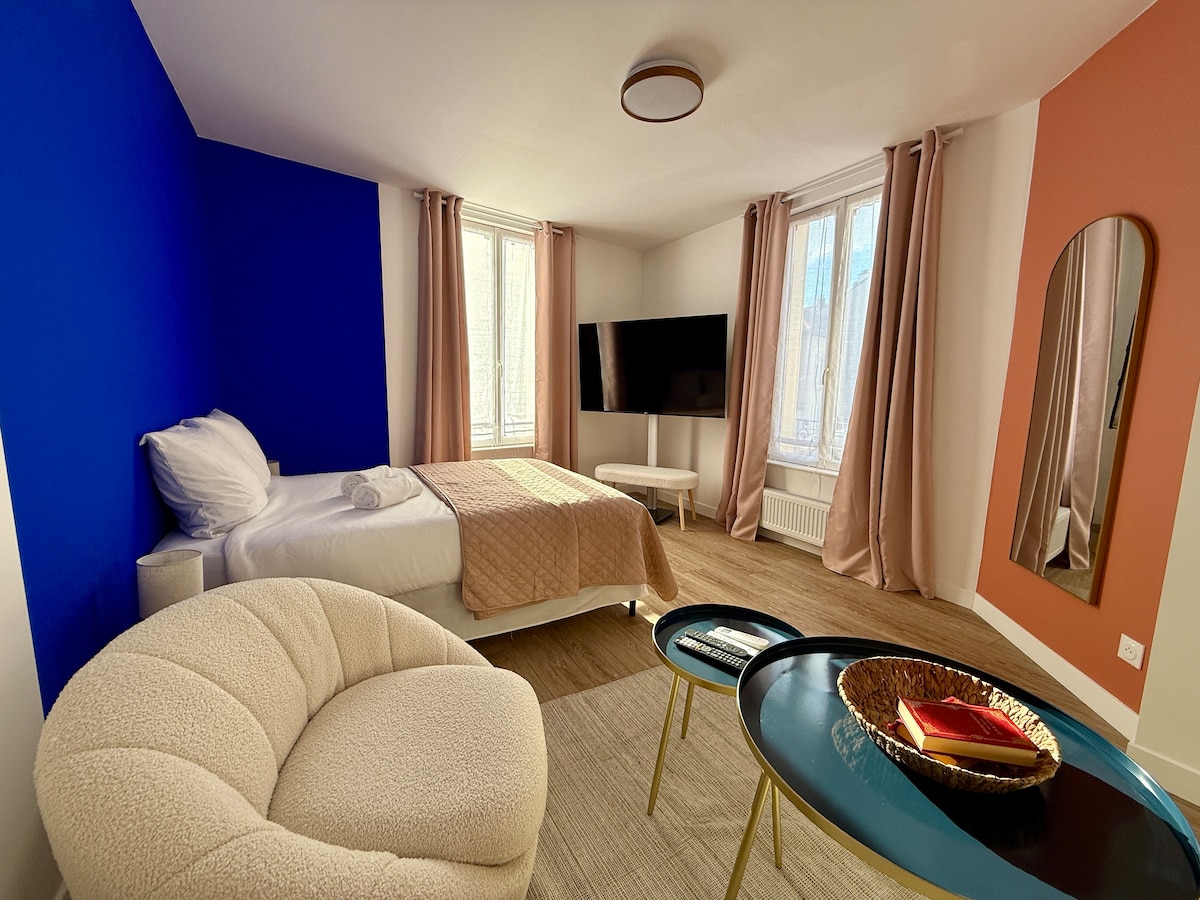 Dra nytta av detta utmärkta läge för att besöka Nancy till fots under din vistelse. Parkering är gratis och lättillgänglig, vilket är en stor bekvämlighet i detta område. Place Stanislas ligger 150 meter bort till fots, och alla stadens sevärdheter ligger mindre än 5 minuters promenad bort. Boende med all komfort, helt renoverat 2024, i en lugn, säker bostad. - Queen size-säng 160 x 200 cm - SMART-TV med TV-kanaler och applikation - Fiber och WIFI