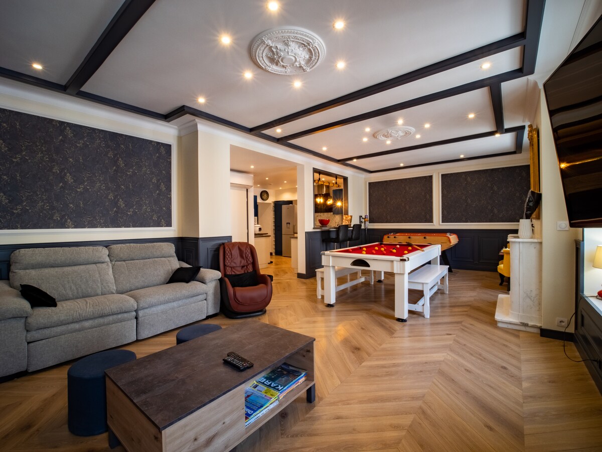 Denna eleganta och rymliga lägenhet är en oas av underhållning och komfort. Beläget mellan centrum och Nancy Thermal, är detta det perfekta valet för dem som vill kombinera lyx och underhållning. Du kommer att välkomnas på en sofistikerad plats, med modern och elegant inredning, som blandas harmoniskt med rymliga och ljusa utrymmen. Vardagsrummet är centralt utrustat med biljard, bordsfotboll och ett schackbräda, vilket garanterar timmar av underhållning för spelälskare.