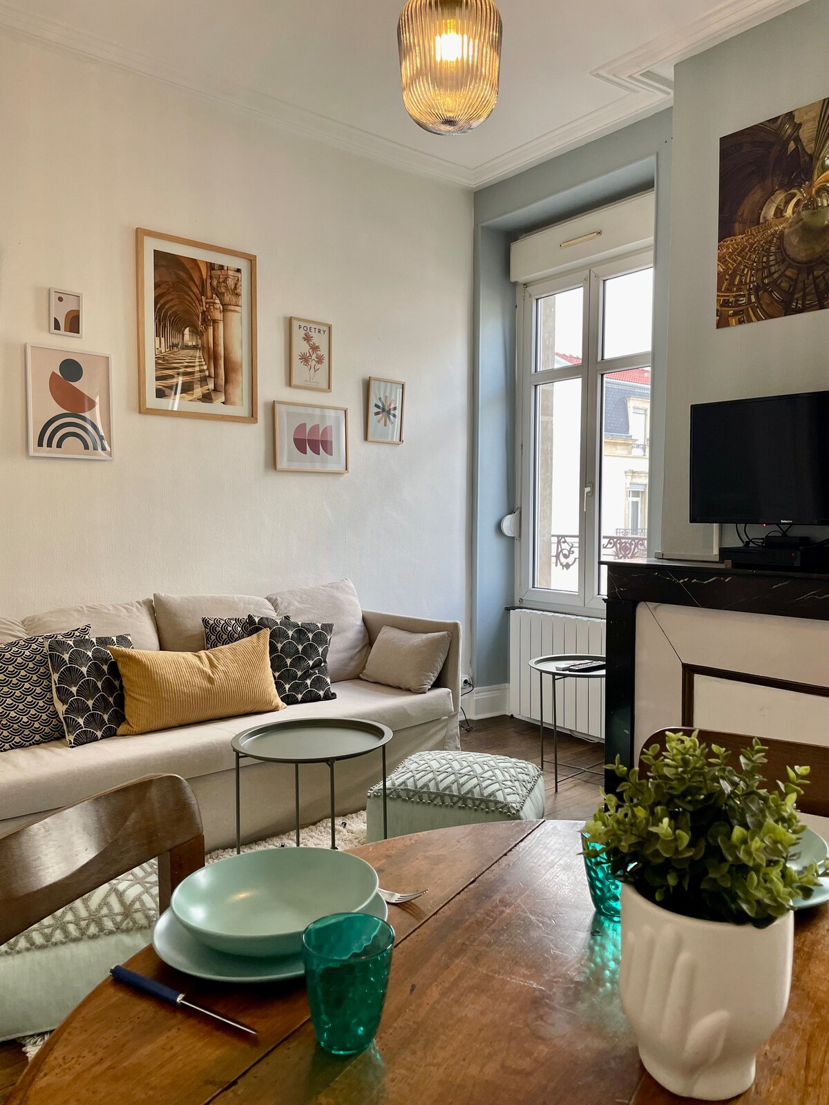 Bienvenue dans votre cocon nancéien ✨😊 À 10 minutes à pied de la gare et du centre-ville, cet appartement de 41 m² vous accueille dans une atmosphère raffinée et chaleureuse. Vous trouverez deux chambres en enfilade, un salon lumineux ainsi qu’une cuisine entièrement équipée. Le Wi-Fi haut débit et les prestations soignées assurent un confort optimal, que ce soit pour travailler ou se détendre 🏡 Chaque détail a été pensé pour vous offrir une expérience agréable et qualitative au cœur de Nancy.