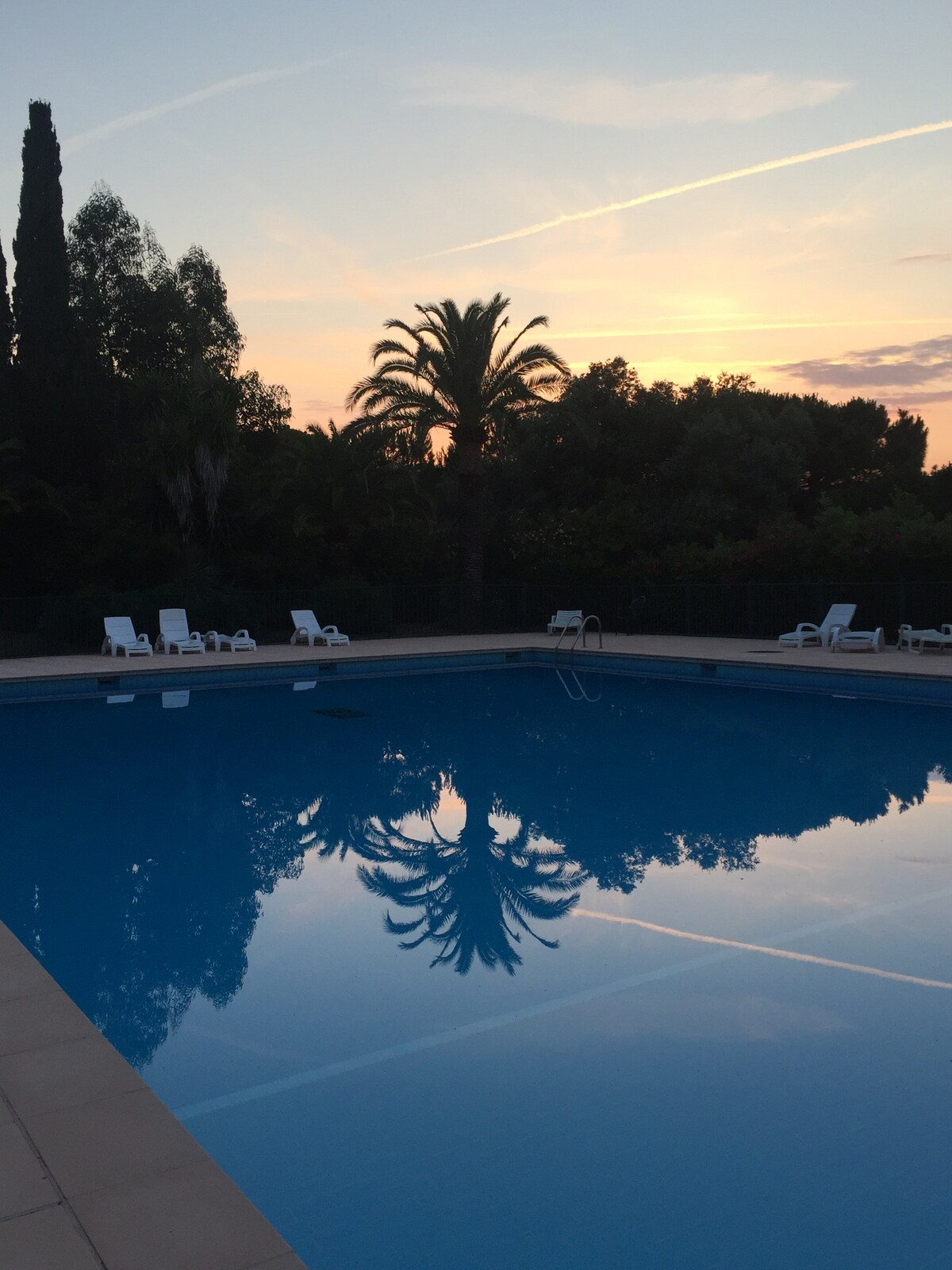 Helt boende: lägenhet på markplan med träterrass med utsikt över havet och parasollträd och en parkeringsplats i hjärtat av Gigaro i ett säkert boende. Sydvästlig exponering gör att du kan njuta av solen hela dagen och solnedgången. Tillgång till stranden är 7 minuters promenad. Lägenheten har en säng och en bäddsoffa, ett kök, ett badrum och en separat toalett