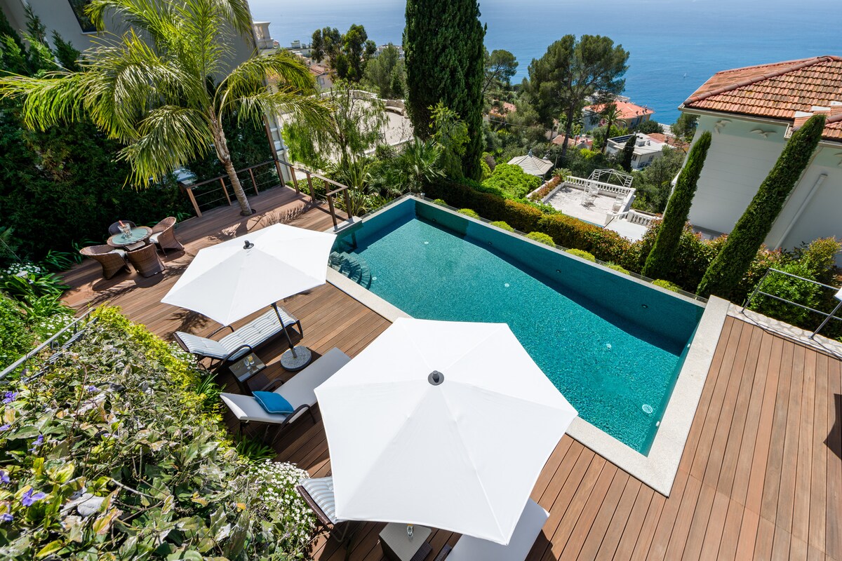 Havsutsikt, terrass, oändlig pool och exotisk trädgård