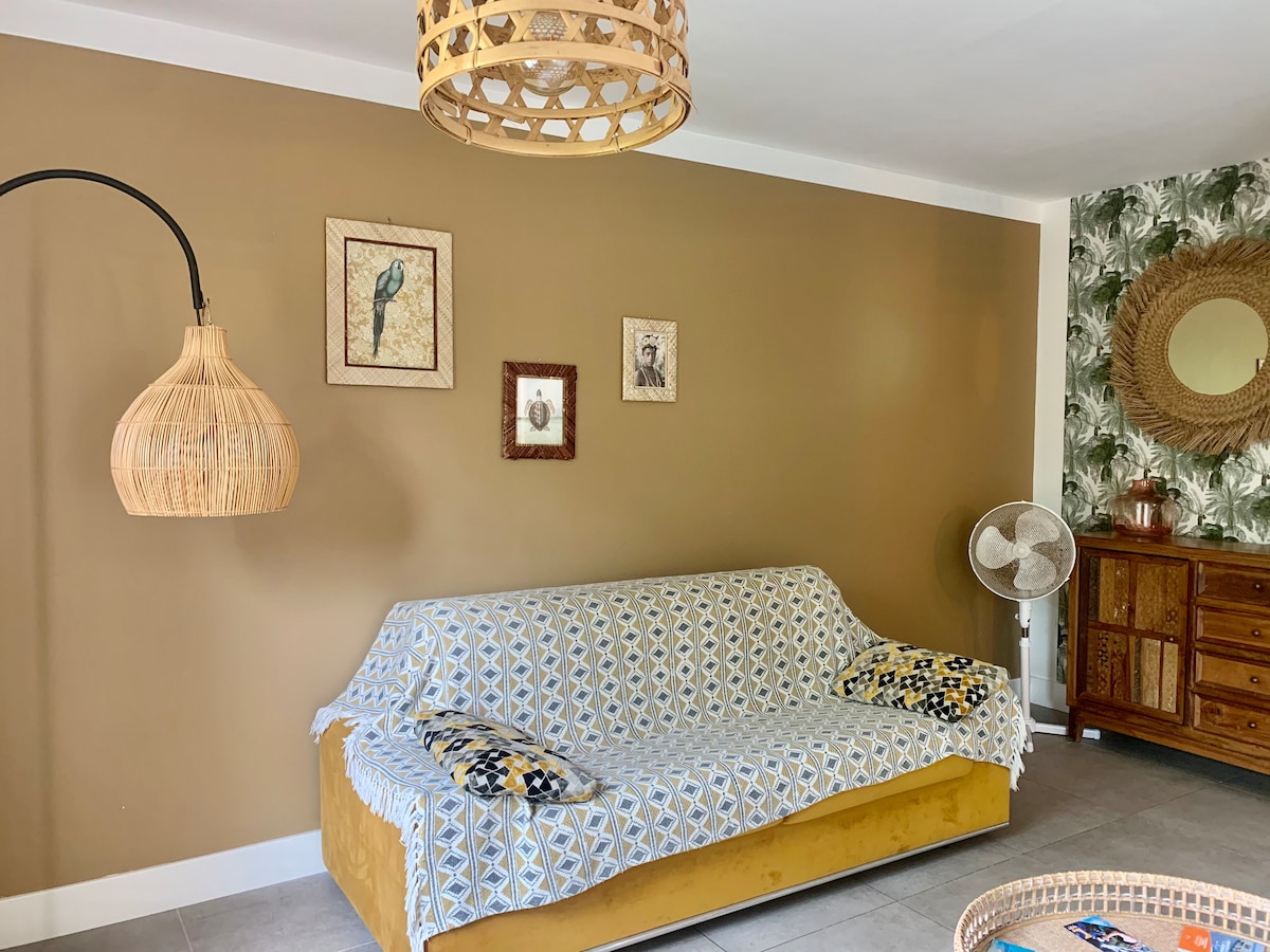 T2 renoverad trädgård 200 m från lagunen, den rymmer 2 till 4 personer. perfekt för ett par med 2 barn. Lägenheten är fullt luftkonditionerad WIFI/TV-anslutning 1 rymlig veranda med en trevlig uteservering med matplats/apéro och trädgård. Fullt utrustat kök, amerikanskt kylskåp, ugn och mikrovågsugn, kaffebryggare, diskmaskin) 1 sovrum med en dubbelsäng 140/190 cm, möjlighet att tillhandahålla barnomsorgsutrustning (spjälsäng, barnstol, bärsele)