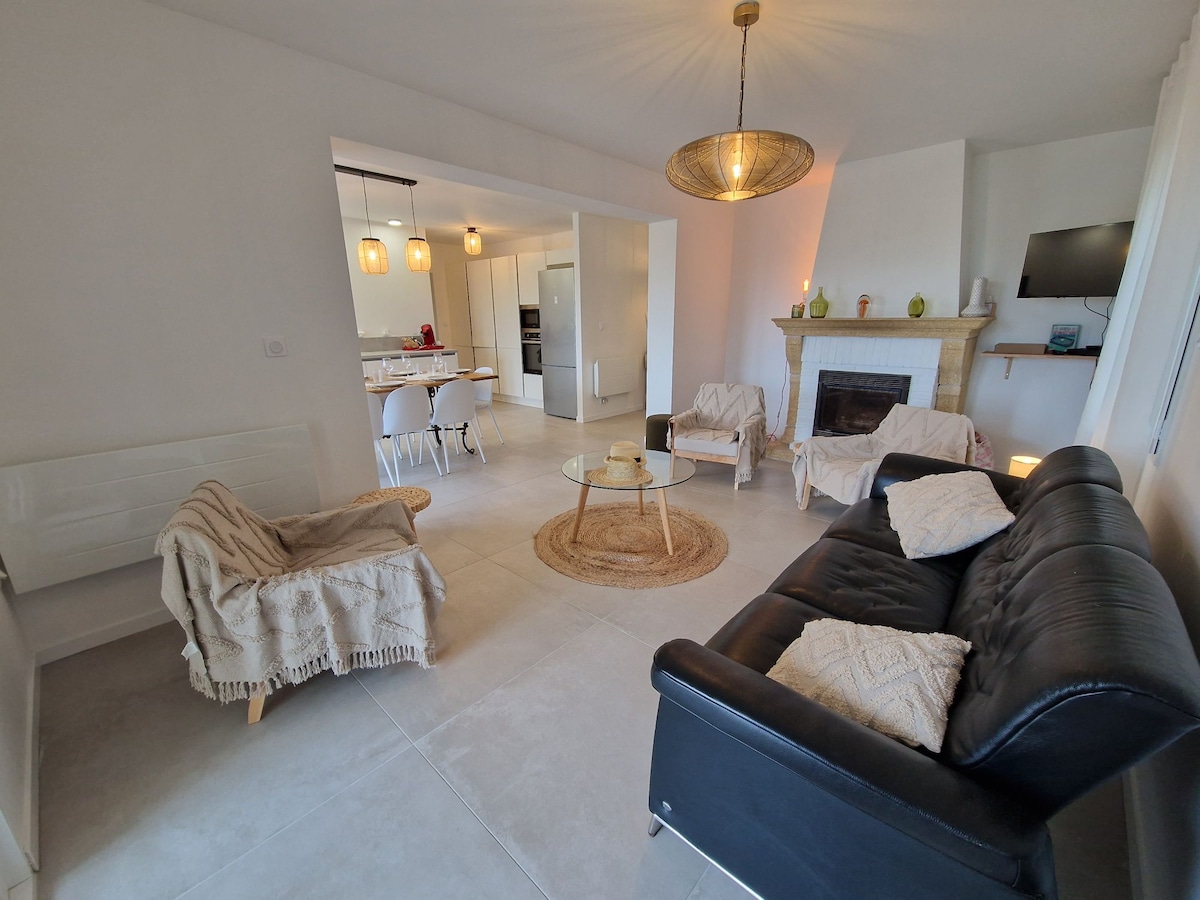 Nauzan strand inom gångavstånd (300 m), ny villa för 8 personer med 3 sovrum, 2 badrum, 2 toaletter, terrasser, utomhuskuddar för avkoppling, vila och gemytlighet. 2 sovrum (160 cm sängar) + 1 sovrum (2 90 cm våningssängar + bäddsoffa) Kök med induktionshäll, ugn, mikro, diskmaskin, kyl-frys, Senseo Switch kaffebryggare, brödrost, vattenkokare, juicer, tvättmaskin. Wi-Fi, inhägnad parkering för flera bilar. Nära Maine Gaudin Golf Course och Equestrian Center Vi accepterar inte husdjur