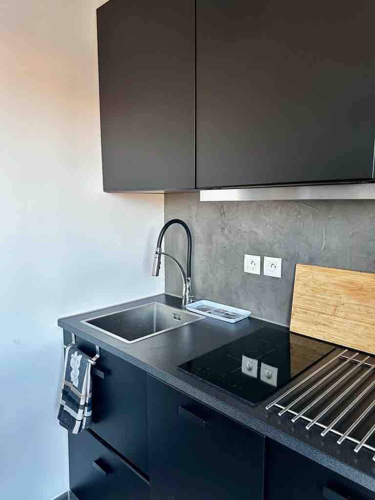En liten juvel vid havet 30 m² stor studio + 15 m² stor terrass, magnifik havsutsikt över stränderna i Escale Borely Studion ligger i stadsdelen Vieille Chapelle i ett nytt säkert bostadsområde Den består av ett amerikanskt kök med kombinerad mikrovågsugn, induktionshäll, diskmaskin, kyl och frys, ett ljust och rymligt vardagsrum med 1 bäddsoffa för 2 personer (utmärkt säng), 2 garderobsskåp, en garderob, en TV, internet, fiber Badrum med dusch + handfat