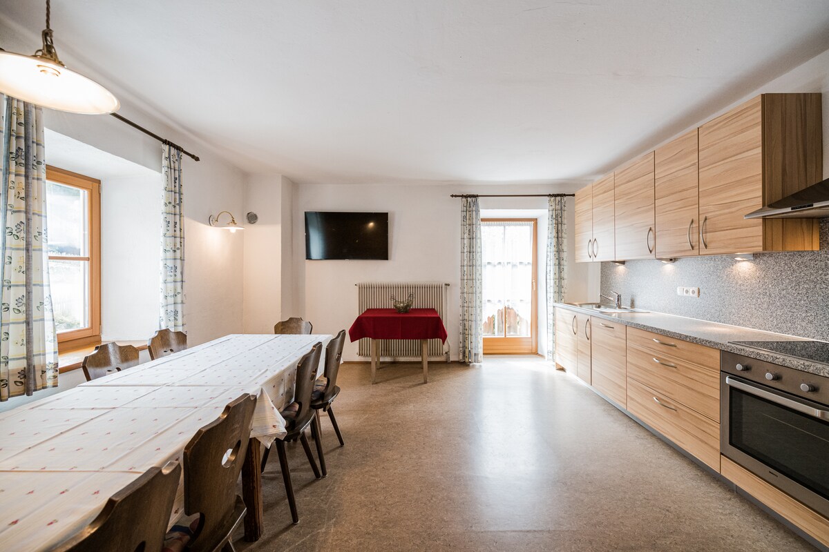 Vår lägenhet PUSTERTAL är en lägenhet på vår egen våning på 1: a våningen i vår gård. Det erbjuder 160 m² vardagsrum, 4 sovrum (var och en med egen handfat och balkong), 2 badrum med dusch, bidé och toalett och ett stort kök för mysig sammankomst med diskmaskin, ugn, kylskåp med frys, SATELLIT-TV och Wi-Fi. 2 ytterligare toaletter ligger i trappan för delad användning med gäster från de andra lägenheterna i vårt hus.