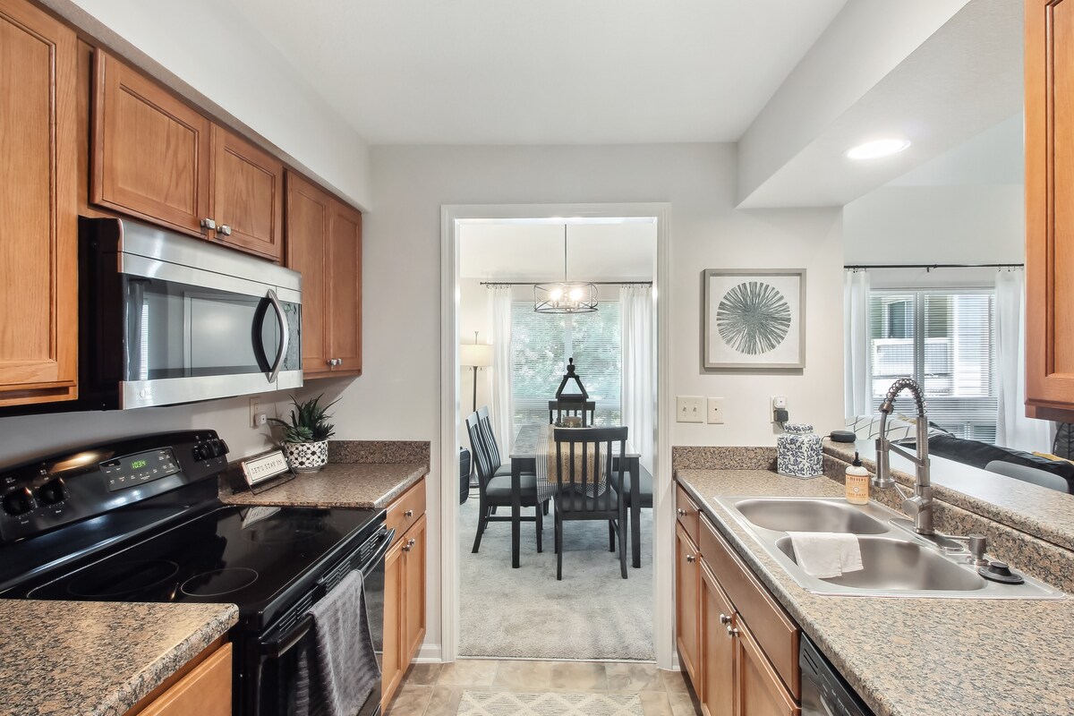 Njut av känslan av att bo på landet samtidigt som du är en del av staden i en vacker, avskild, COVID-fri miljö! Njut av den natursköna utsikten över skogen och djurlivet utanför varje fönster, och dra nytta av att vara nära alla bekvämligheter i stadslivet. Det är perfekt för familjer i stan för sportturneringar, släktingar som besöker lokala familjemedlemmar, eller semesterfirare som passerar genom på I-435 som vill ha ett rymligt utrymme att bo medan de njuter av staden.