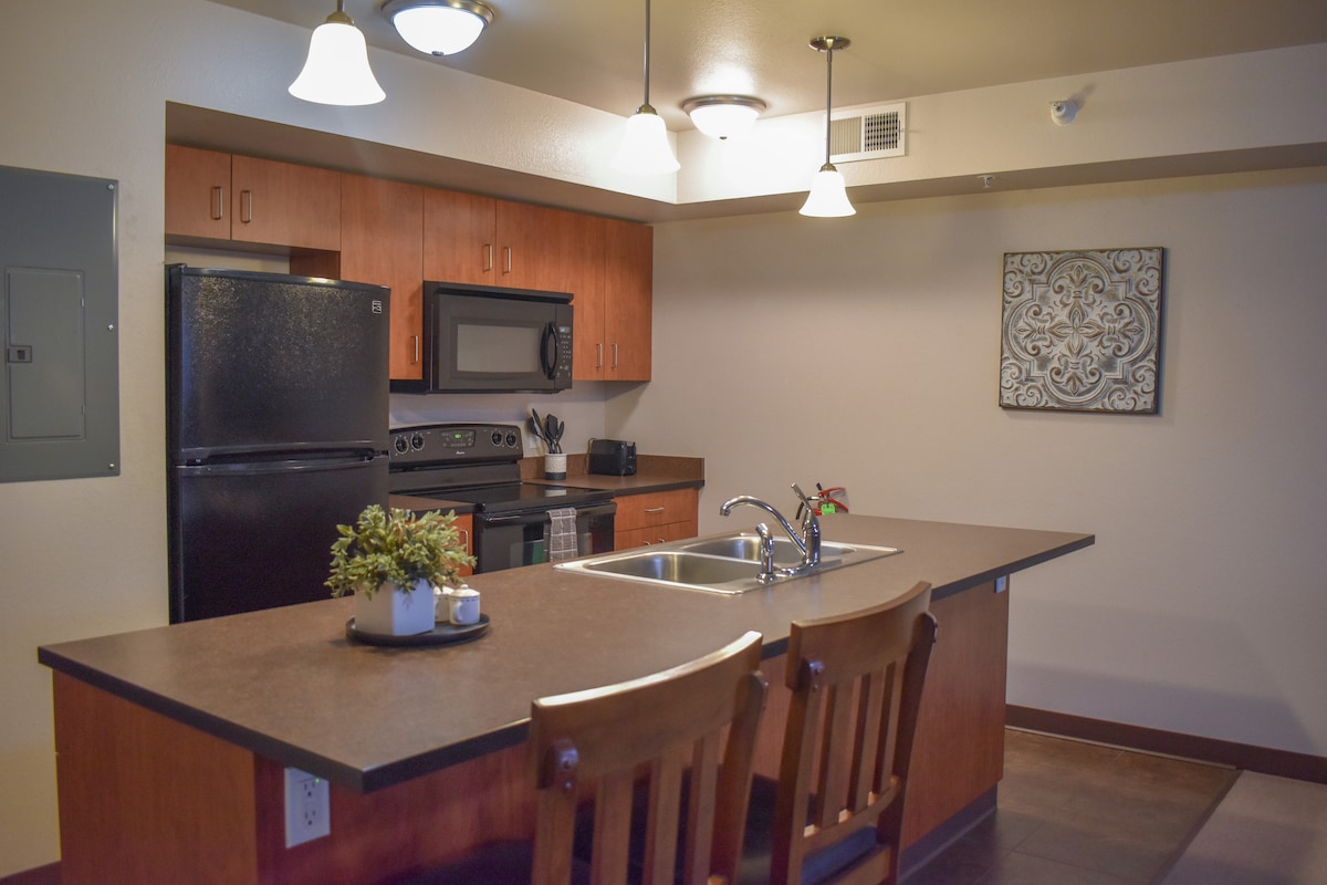 *Andra våningen. Gör detta till ditt favoritstopp när du besöker Mhk, Ft. Riley eller KSU. Gångavstånd till KSU & Aggieville shopping, mat och dryckesdistrikt. Perfekt för längre vistelser, affärer eller för nöjes skull. Denna mysiga lägenhet har: -1 sovrum, 1 badrum - Tvättmaskin/torktumlare - Fullt möblerat kök - Bekvämt vardagsrum med utrymme för underhållning - Smart och kabel-TV - Snabbt Wi-Fi. Om vår kalender är full, vänligen kontrollera PERFECT HOME #1, 2, 3, 4, 7, ELLER 9, samma bra läge, pris och bekvämligheter.