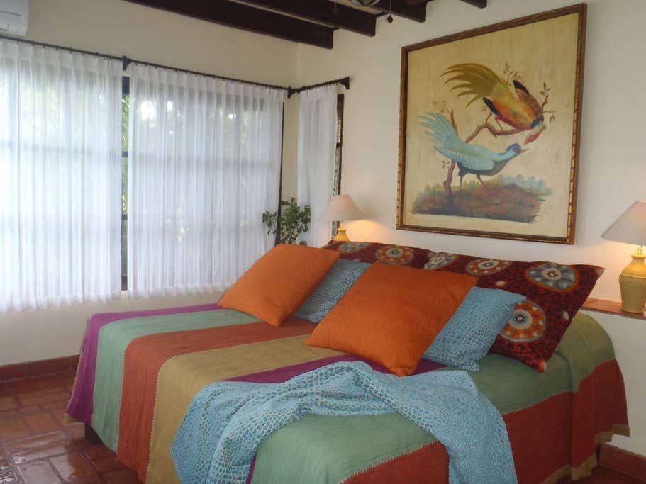 Med den trädfyllda gården med apor, fåglar och leguaner ligger detta ljusa, luftiga, teakhem bara 50 meter från stranden, nära hjärtat av Sámara. Fantastisk utsikt över naturen och havsljud. Detta luftiga hus har ett kök i öppen planlösning - vardagsrum med många konstnärliga, ursprungliga detaljer i lokala återvunna skogar; terrass, uteservering, hängmatta och trädgård. Du kan promenera var som helst på några minuter och gå barfota till stranden! OBS: Vi har INTE (ännu!) luftkonditionering (planeras till mitten av 2026), men gott om fläktar för luftcirkulation!