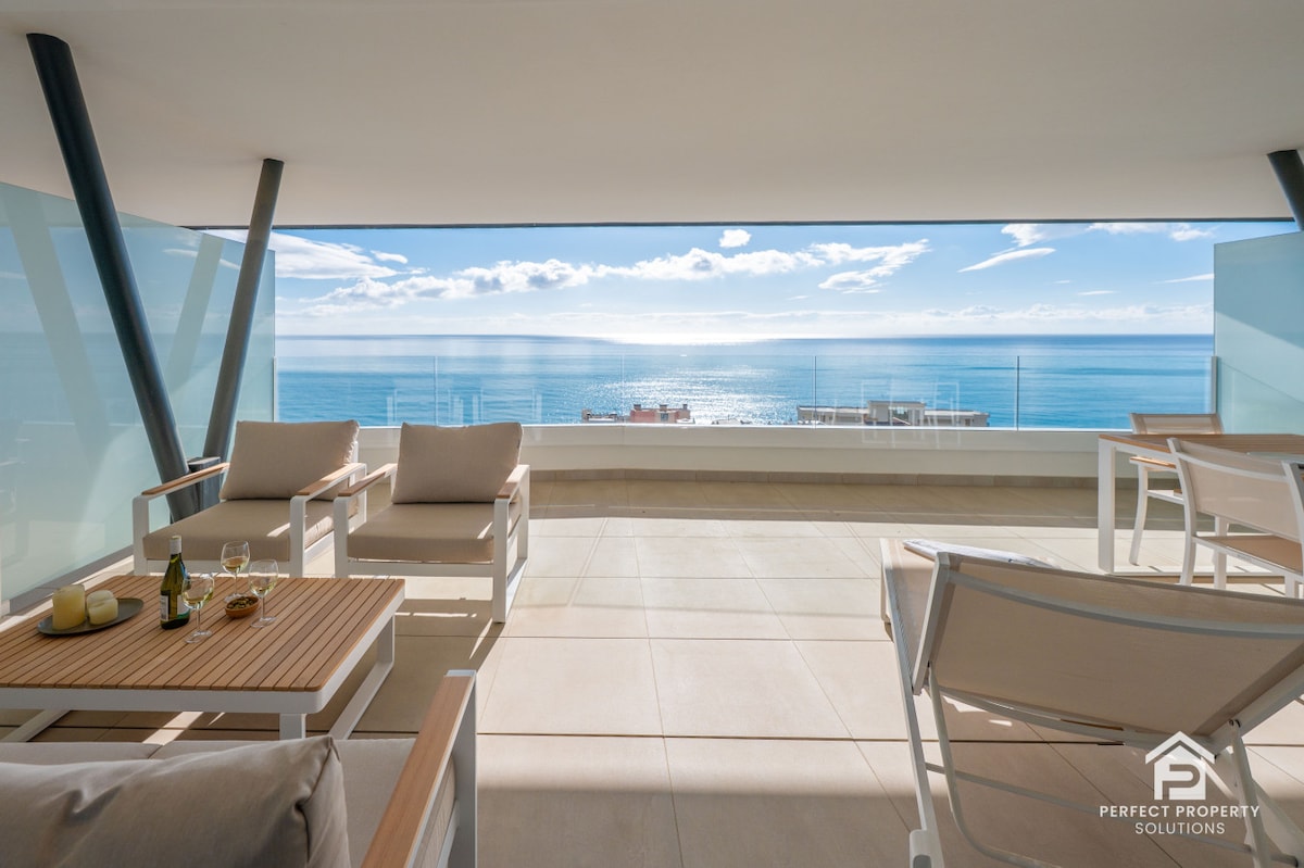 ⚠️ Observera: Gemenskapspoolen är för närvarande stängd för renovering tills vidare. Njut av en modern och elegant lägenhet med hisnande havsutsikt. Med ett öppet vardagsrum, fönster från golv till tak, en rymlig balkong med en lounge. Huvudsovrummet har eget badrum, plus ett andra sovrum och ett badrum. Parkering, Wi-Fi och ett fullt utrustat kök säkerställer en bekväm vistelse.