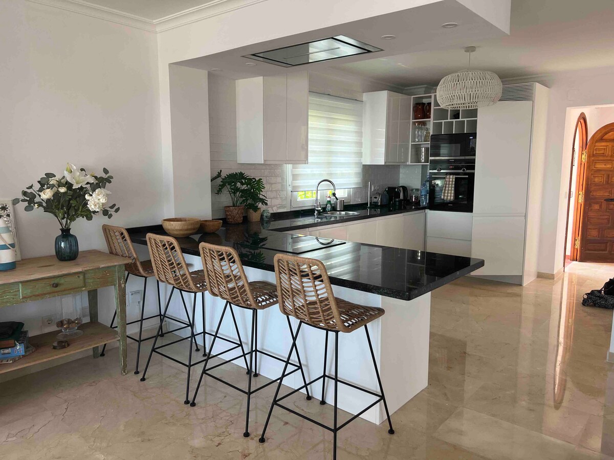 Ljus, modern och bekväm lägenhet med 2 sovrum för upp till 5 gäster, idealiskt beläget i hjärtat av Gamla stan i Estepona. Perfekt för familjer, par eller distansarbetare, med två sovrum och en bäddsoffa i vardagsrummet, bara 5 minuters promenad från stranden och promenaden. Perfekt för veckolånga vistelser – professionell städning ingår för vistelser på 7 nätter eller längre. Ingen bil behövs — allt ligger nära och är lättillgängligt.