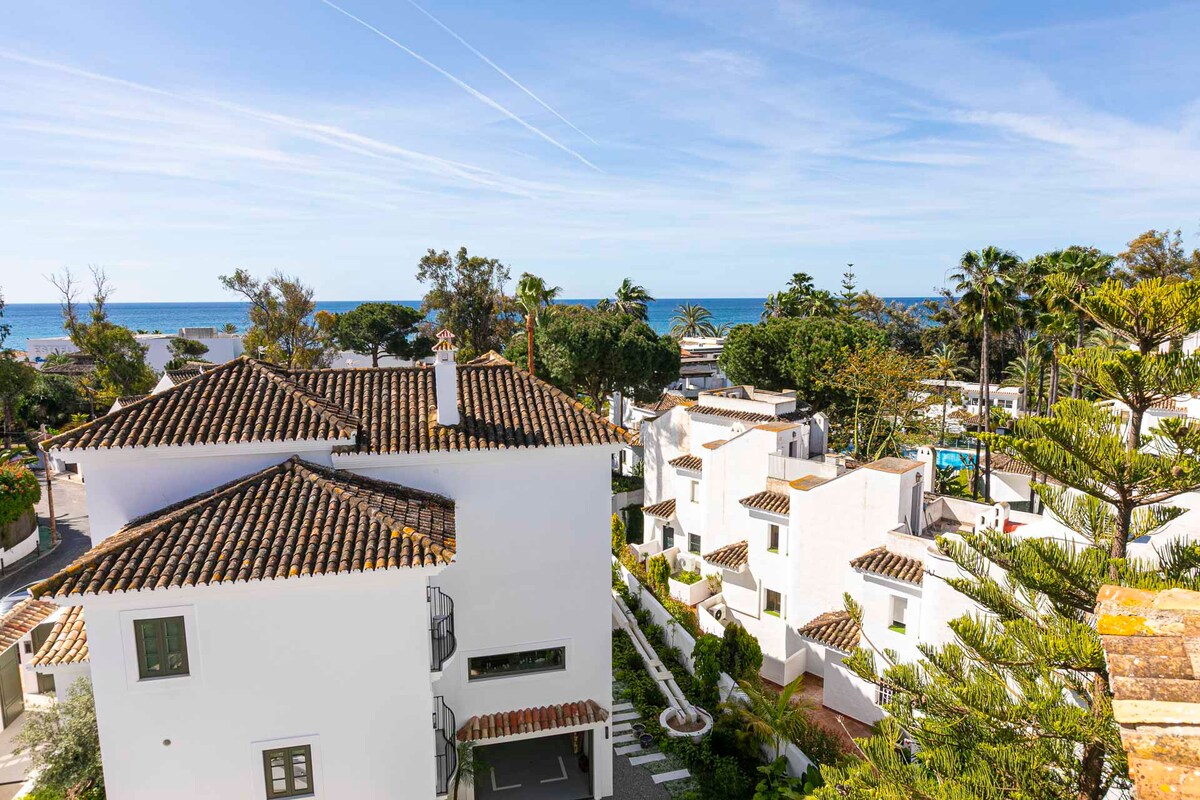 Njut av en exklusiv duplex takvåning vid stranden i den prestigefyllda Golden Beach, Playa de las Chapas. Den är perfekt för familjer och har 3 sovrum med eget badrum, inklusive en fantastisk huvudsvit med hisnande 180º havsutsikt och en unik, fridfull atmosfär. Utrymmet har ett fullt utrustat kök, ljust vardagsrum, flera terrasser med chill-out område och grill. Lummiga trädgårdar, flera pooler, direkt tillgång till stranden och bara några steg från La Plage Casanis.