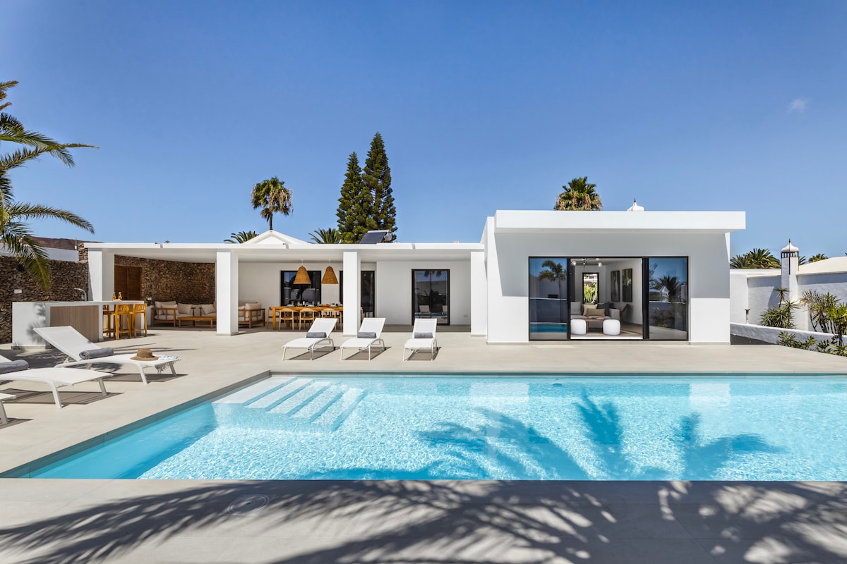 Minimalistiskt hus med vulkanutsikt och uppvärmd pool