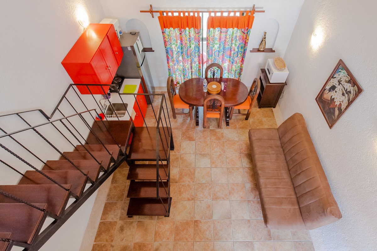 Fullt utrustad studio i ett litet, privat komplex av 8 studior, alla utformade för att du ska känna dig som hemma. Beläget i Playa del Carmens centrum, bara 6 kvarter från den berömda "5th Avenida" och 7 kvarter från vackra karibiska stränder. Plus: en stor stormarknad ett kvarter bort, banker, apotek, restauranger med lokal mat runt omkring. Vi har gratis parkering beroende på tillgänglighet. Välkommen!