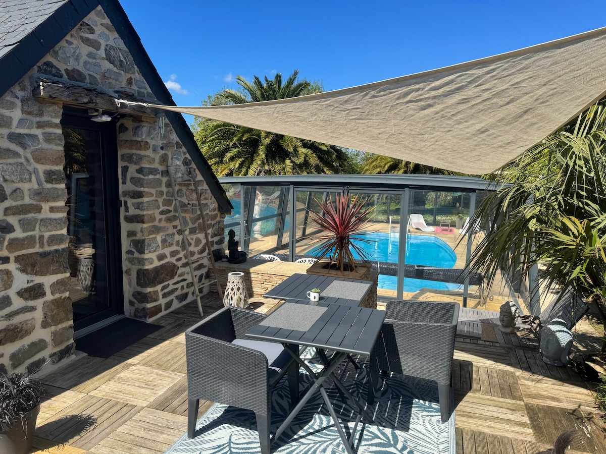 Stuga klassad 3 stjÀrnor i oktober 2022 av turistbyrÄn i FinistÚre. FristÄende hus med trÀfasad pÄ 55 m2 renoverat 2021 100 meter frÄn en mycket vacker strand. Stor angrÀnsande terrass, utan insyn, lugn, med liten havsutsikt och direkt tillgÄng till en stor trÀdgÄrd som korsas av en vattendrag. Ljusa och bekvÀma inomhusutrymmen. UppvÀrmd utomhuspool, belÀgen 20 m frÄn huset huset, omgiven av en trÀterrass med utsikt över trÀdgÄrden och havet.