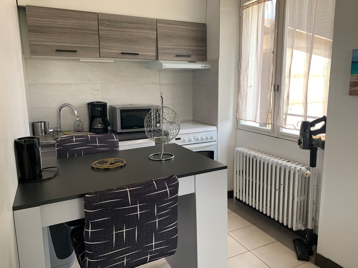 Trevlig liten lägenhet helt renoverad och inredd Nära spårvagn, buss och butiker. Mycket lugnt område. Gratis parkeringsplatser på gatan och privat parkering. Säng, sängkläder och handdukar av hög kvalitet. Barnsäng tillgänglig samt madrasskydd Stort förvaringsutrymme vid ingången (garderob och hyllor, inklusive för bagage) Rullgardiner som möjliggör total mörker.