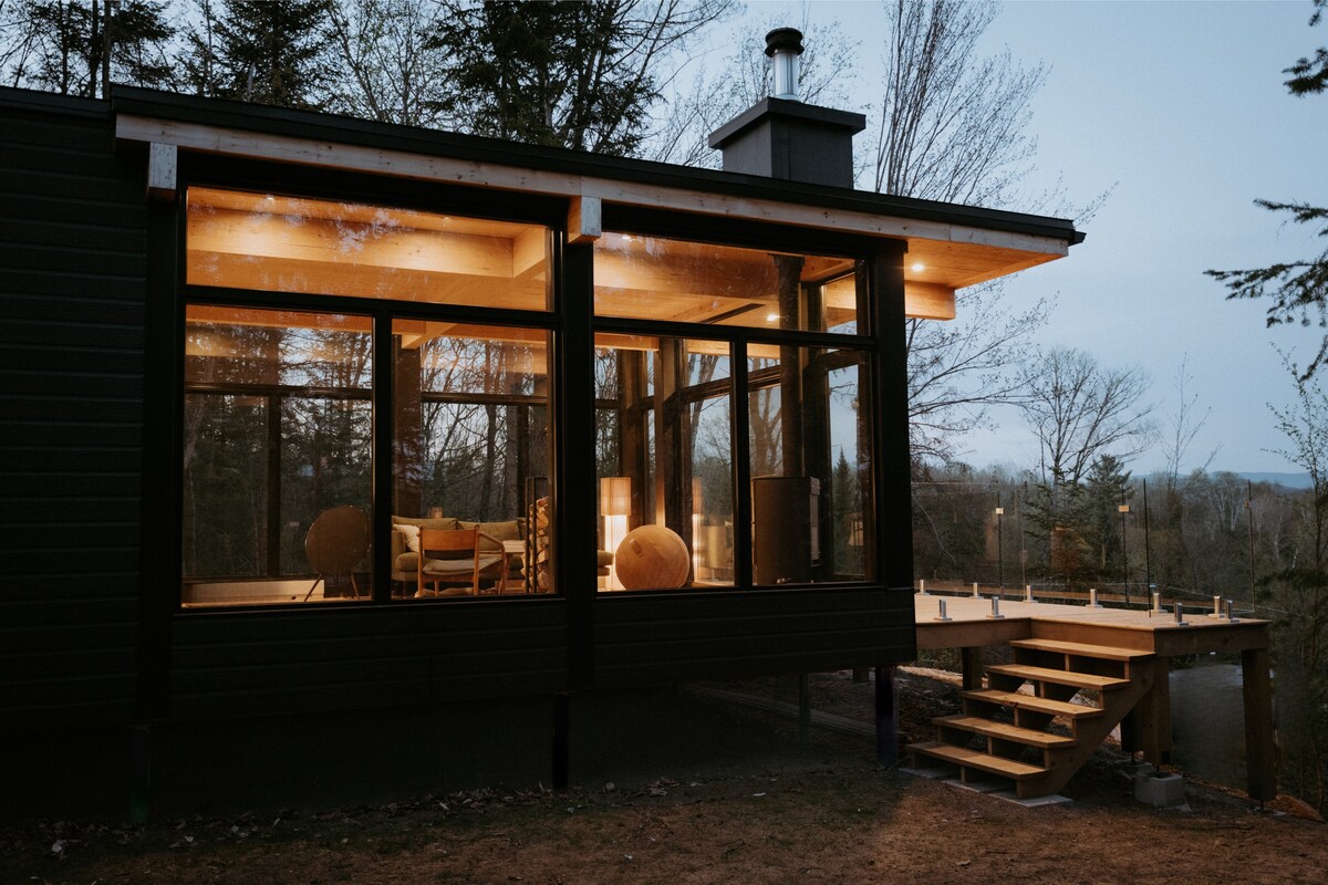 Välkommen till La Khabine! Denna mysiga, moderna stuga har allt du behöver för att koppla av och få kontakt med naturen. Njut av ett glas vin med ljudet av en sprakande eld i den vedeldade eldstaden. Njut av utsikten över skogen genom de omgivande fönstren från golv till tak. Koppla av i den privata utomhus bastun i cederfat. Naturliga självvårdsprodukter, ved, tvättmedel och höghastighets Wi-Fi är alla gratis. Vi hoppas att du kommer att älska vår lilla stuga med fönster lika mycket som vi gör :)