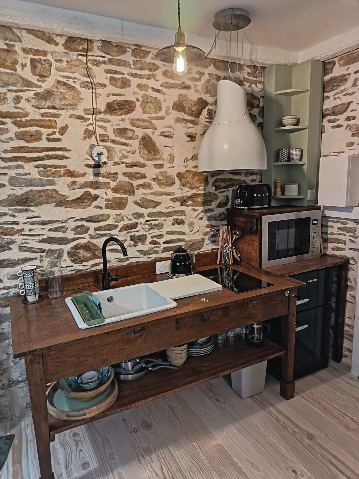 Detta är en gammal uthus där cider gjordes, helt renoverad på 36 m2 på marken med ett flytande mezzaninvåning. Boendet är oberoende och erbjuder alla moderna bekvämligheter i ett nuvarande hem med all användbar utrustning. Den privata parken på mer än 5 000 m2 är tillgänglig för resenärer som också kan gå och se getter och får i deras inhägnad.