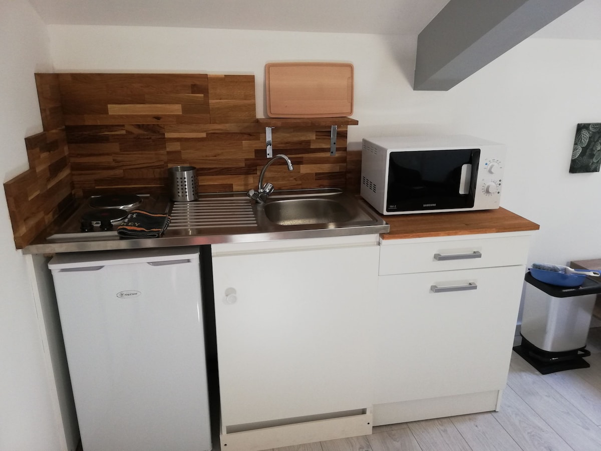 Studio med sovrum och badrum på mezzaninen, utrustat kök med rätter, vattenkokare, brödrost, kaffebryggare, mikrovågsugn och kylskåp inom 10 minuter från Futuroscope, nära butiker (stormarknad, bageri, apotek,...) 45 min från apornas dal, 1 timme från Marais Poitevin och 1h30 från La Rochelle, Puy du Fou och slotten i Loire. Observera: Lakan tillhandahålls från 2 nätter (160x200 / 140x200). Badlakan och tvål ingår i bokningen.